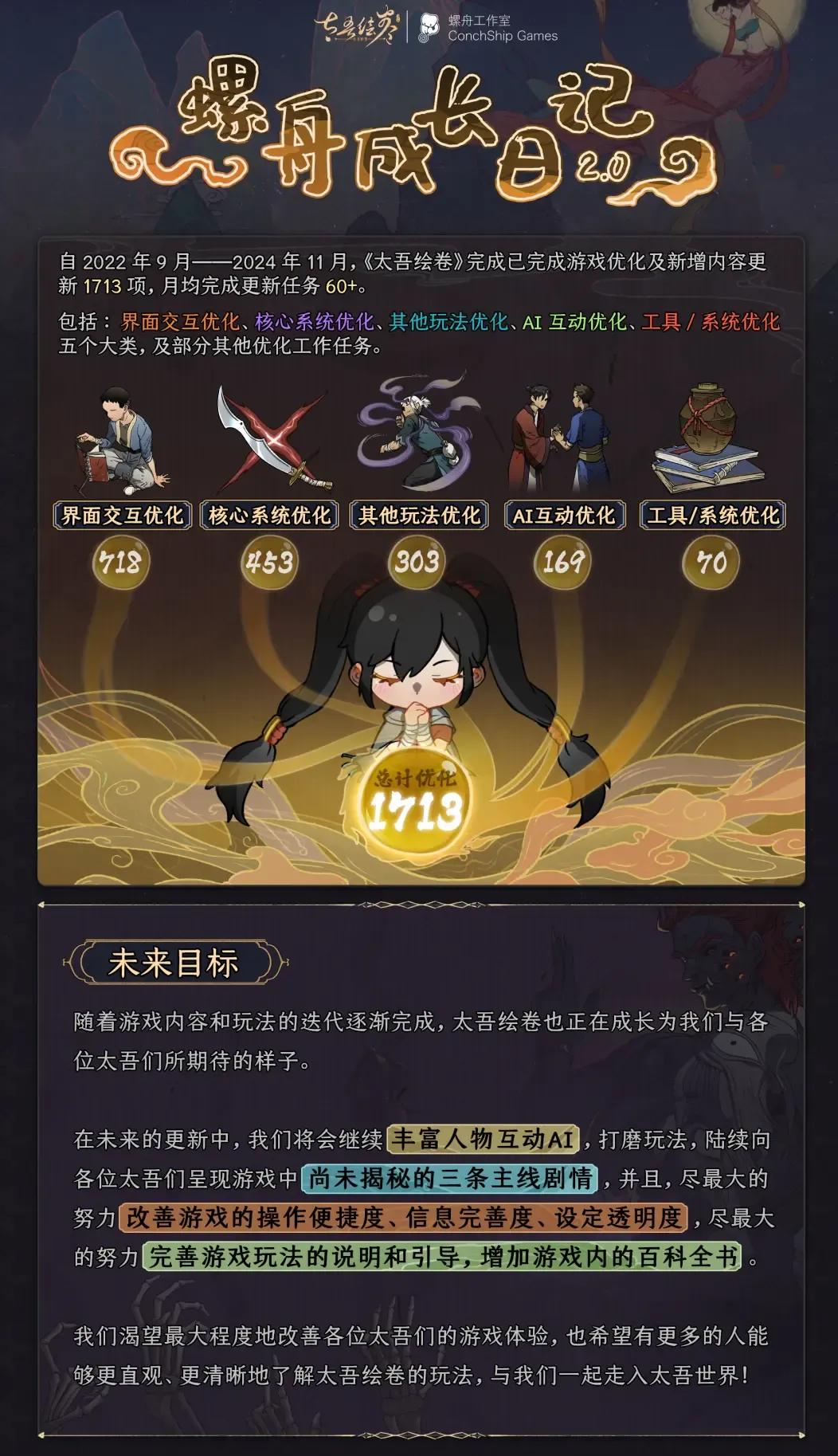 近三年来,太吾已经进行了40多次超大型更新,每次更新内容平均有接近50条,除此之外的小型更新更是多达上百次。这些更新,前前后后已经实现了上千条玩家的需求反馈。