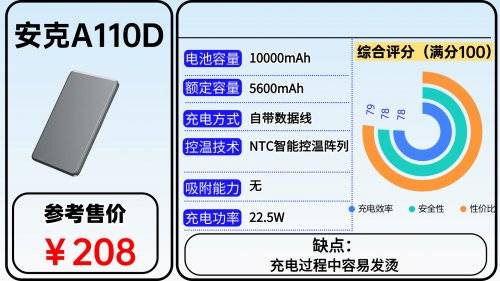产品特点:安克A110D充电宝拥有10000mAh的电池容量,日常通勤为手机充电一次以上完全没问题。支持22.5W的快充功率,应急时为手机补充电量速度不慢,非常可靠。