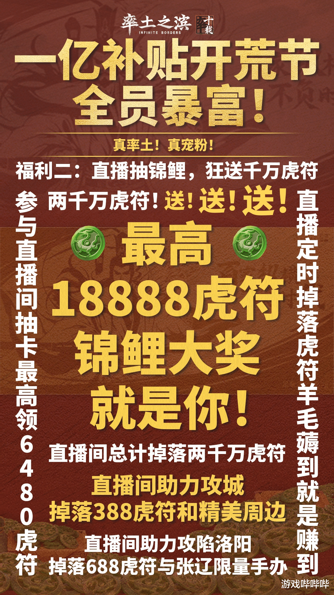 不止如此,官方直播间也火力全开疯狂“撒币”,一口气放出2000万虎符供抽奖,其中还有24个神秘的锦鲤大奖。并且活动还设置了“阳光普照奖”,开启100%中奖率的幸运抽奖环节,即便运气不好,也能最少拿个50虎符的奖励。