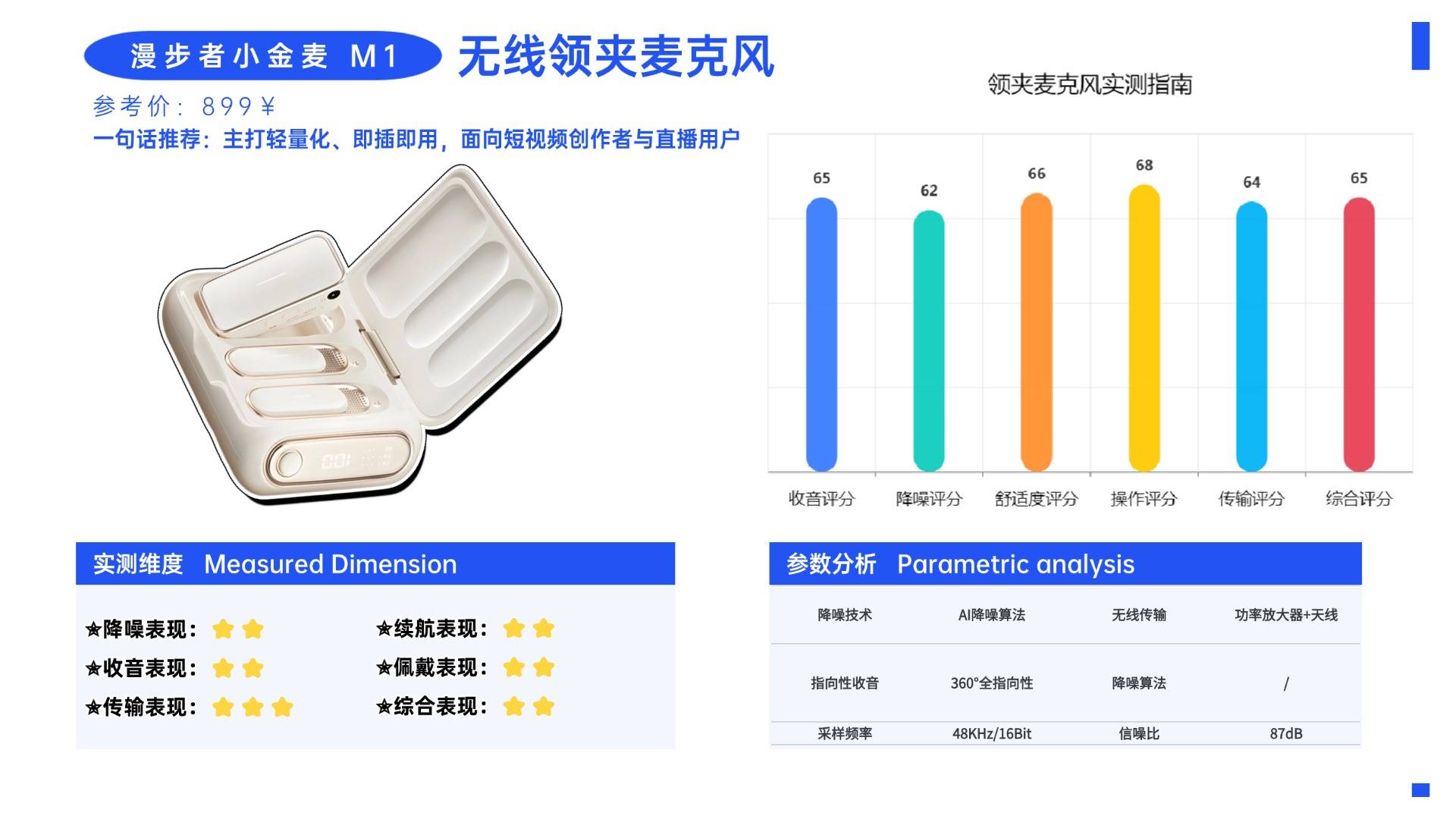 漫步者小金麦 M1 以 轻巧便携、即插即用、稳定无线传输 为核心优势,适合短视频创作、轻量直播及日常外拍。功能简单、操作易上手,属于入门向高性价比选择,但在灵活调音、极端环境降噪和专业需求上存在一定局限。对于初学者或预算有限的创作者,M1 是一款可靠的入门利器。