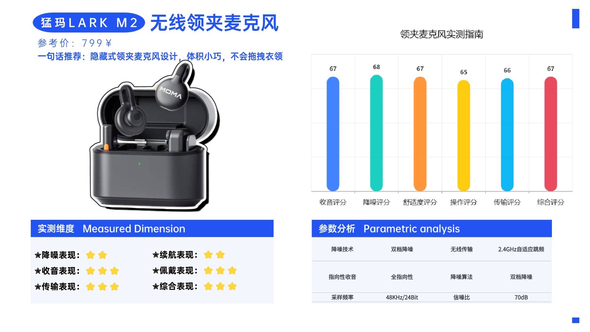 猛玛 LARK M2 以 隐形设计、稳定传输、高保真音质、长续航 为核心优势,适合创作者、Vlog 及专业录制使用。缺点在于极端环境下降噪能力略有限,操作时需注意迷你机身的稳固性,但整体性能均衡,便携实用,是专业与隐形需求兼顾的无线领夹麦克风选择。