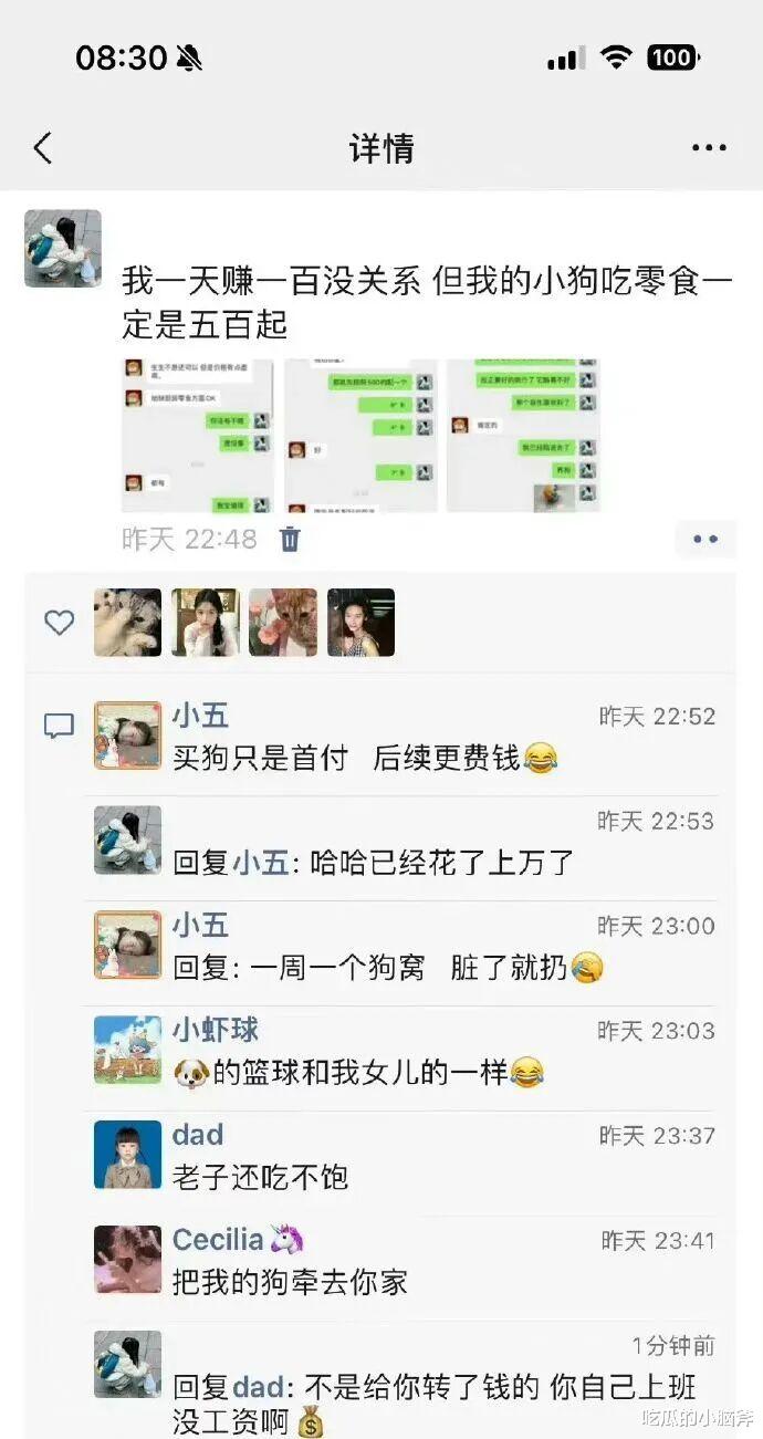 还有人分享,自己给家里的小狗买了几包贵价零食,拍了照片发朋友圈,结果她爸直接评论:“老子还没吃饱呢,你倒先给狗买这么贵的东西,你眼里还有没有我这个爸?”