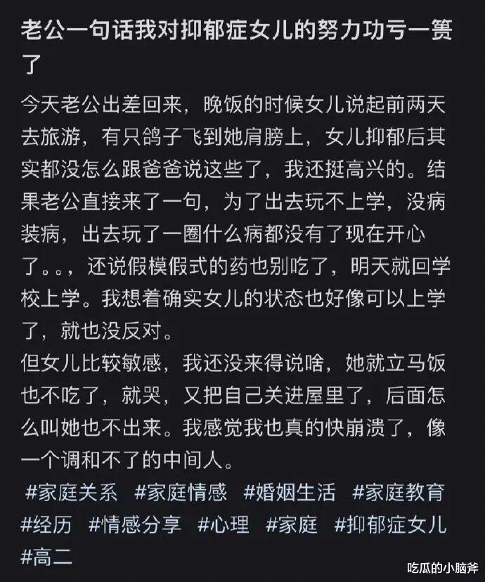 回来之后,她心情好了很多,主动跟爸爸分享旅途中遇到的开心事,比如看到了好看的风景,吃到了好吃的小吃,结果她爸不仅没安慰她,还直接怼她: