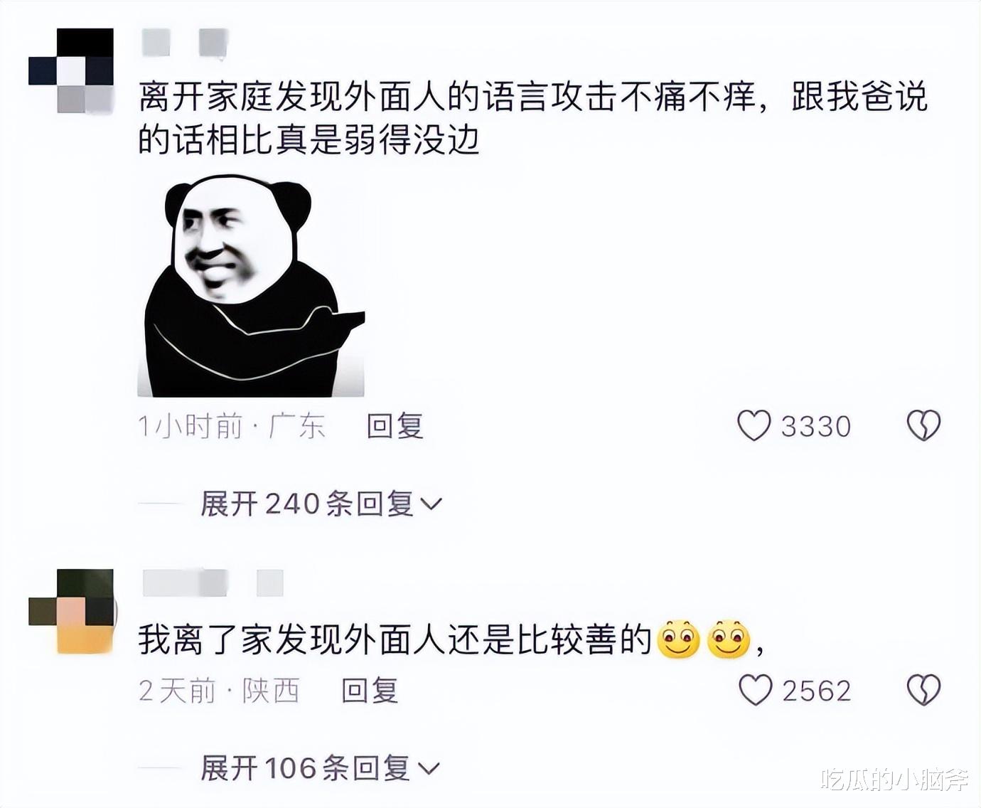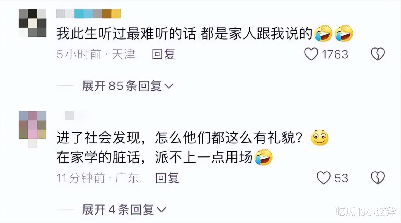 还有人说:“这辈子听过最难听的话,不是来自陌生人的恶意攻击,不是来自同事的背后捅刀,而是来自我的爸妈,来自我最亲近的家人。