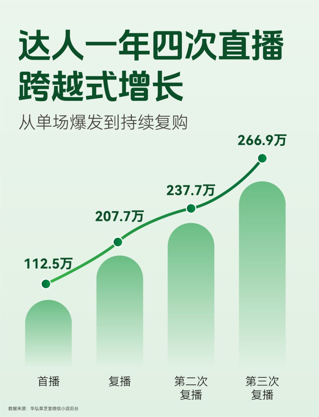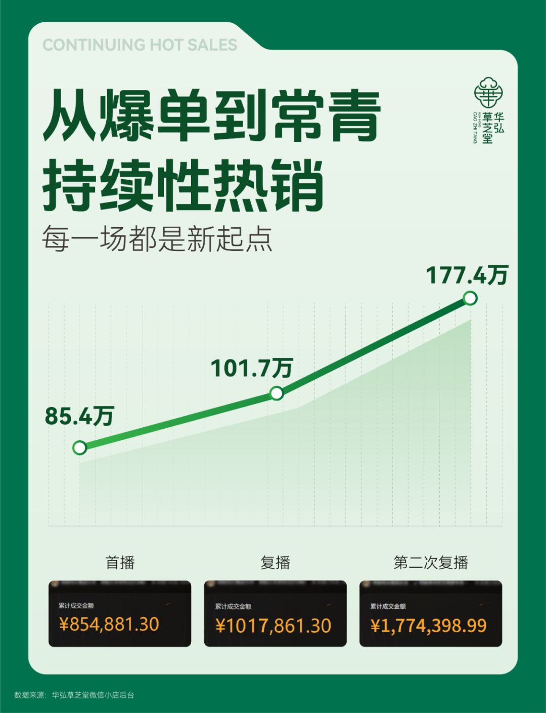 5.信任为基:长效合作打造增长飞轮在达人合作日益短效化的今天,大多品牌与达人关系仅停留在“单次交易”。而华弘草芝堂通过产品硬实力+专业直播赋能,构建了独特的“达人共生模式”,让商业合作升维为持续增长伙伴关系。多年多场直播合作,单场GMV仍只涨不跌。当同行还在为坑位费讨价还价时,华弘草芝堂与达人共同构建起“信任-增长-再信任”的正向循环。