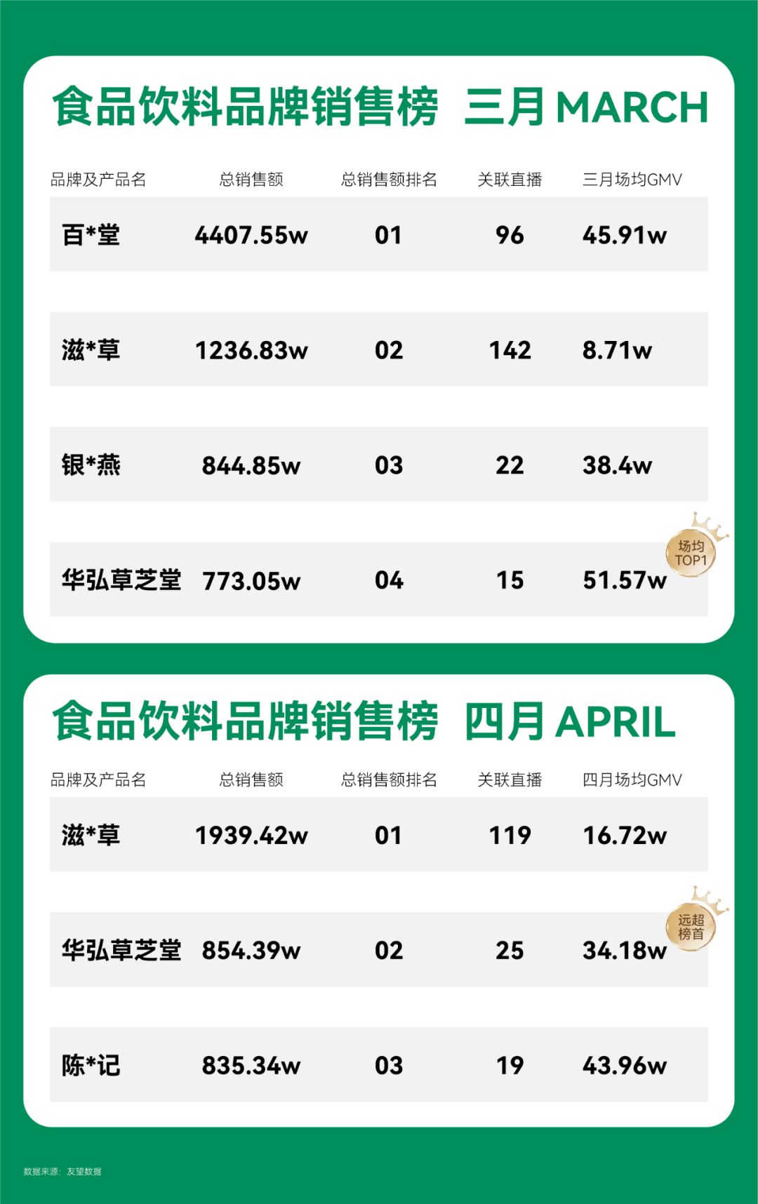 进入2025年,其周年溯源季的达人合作依然热度不减,战绩持续攀升。引用第三方平台“友望”的数据,2025年3月及4月,华弘草芝堂微信小店的销售额在灵芝垂直品类中位列第一。因为极度重视交付,严选合作伙伴,在每月直播场次不多的情况下,以灵芝单一品类产品连续多月总销售额位列食品饮料榜 Top 4,场均 GMV 遥遥领先。以今年3月为例,其共进行15场关联直播,以场均GMV51.57W的表现位居食品饮料品牌榜首位,这一数据是榜单前四品牌中最低场均GMV (8.71W)的近6倍。4月关联直播场次增至25场,总销售额达854.39W,位列食品饮料品牌榜第二位,但值得注意的是,当月34.18W的场均 GMV 整整是榜首品牌场均 GMV 的2倍!