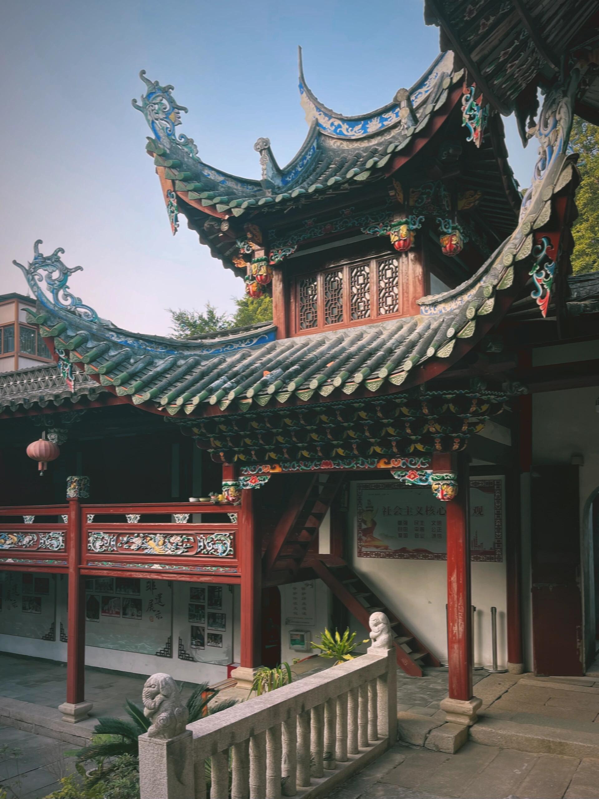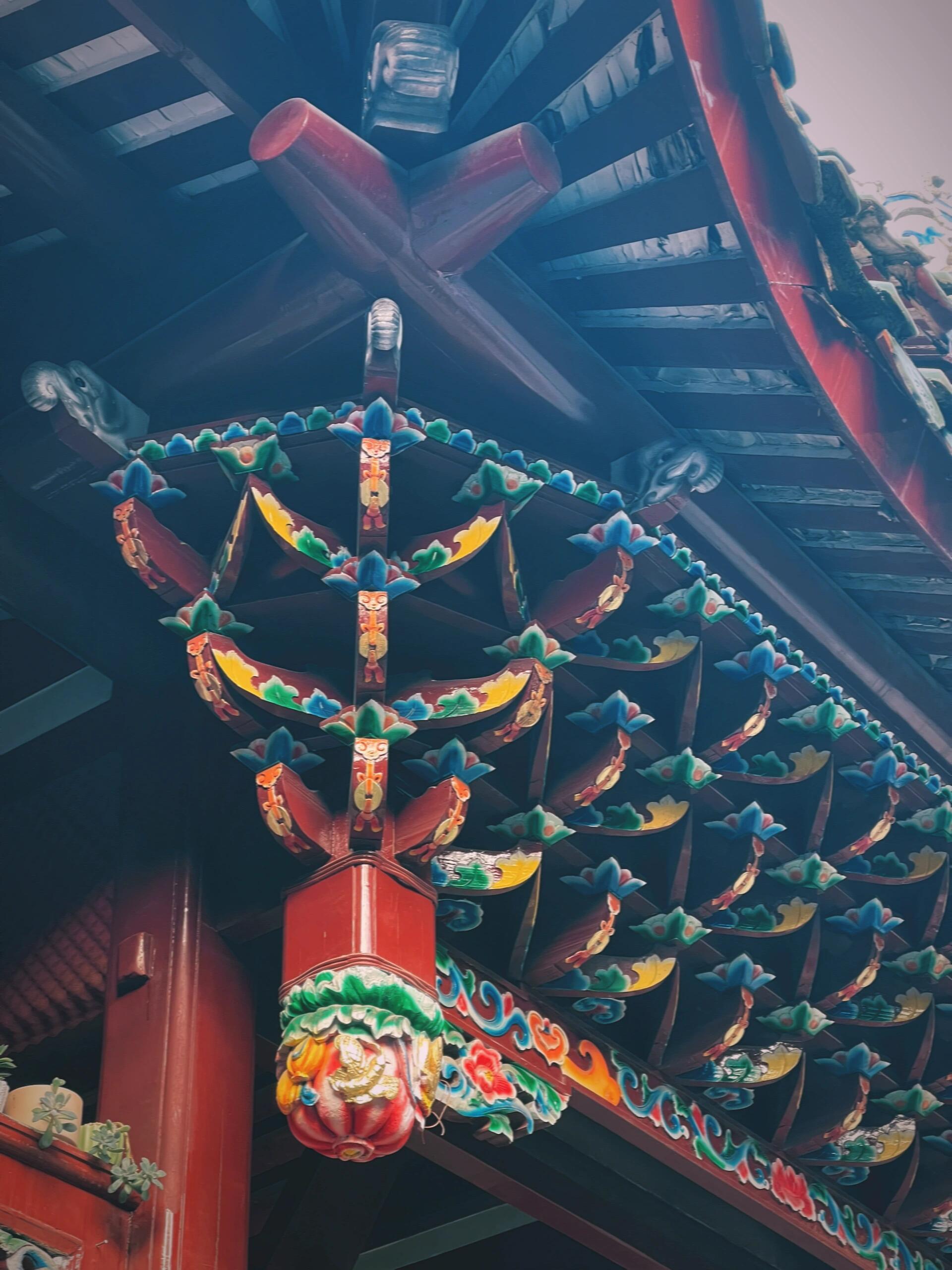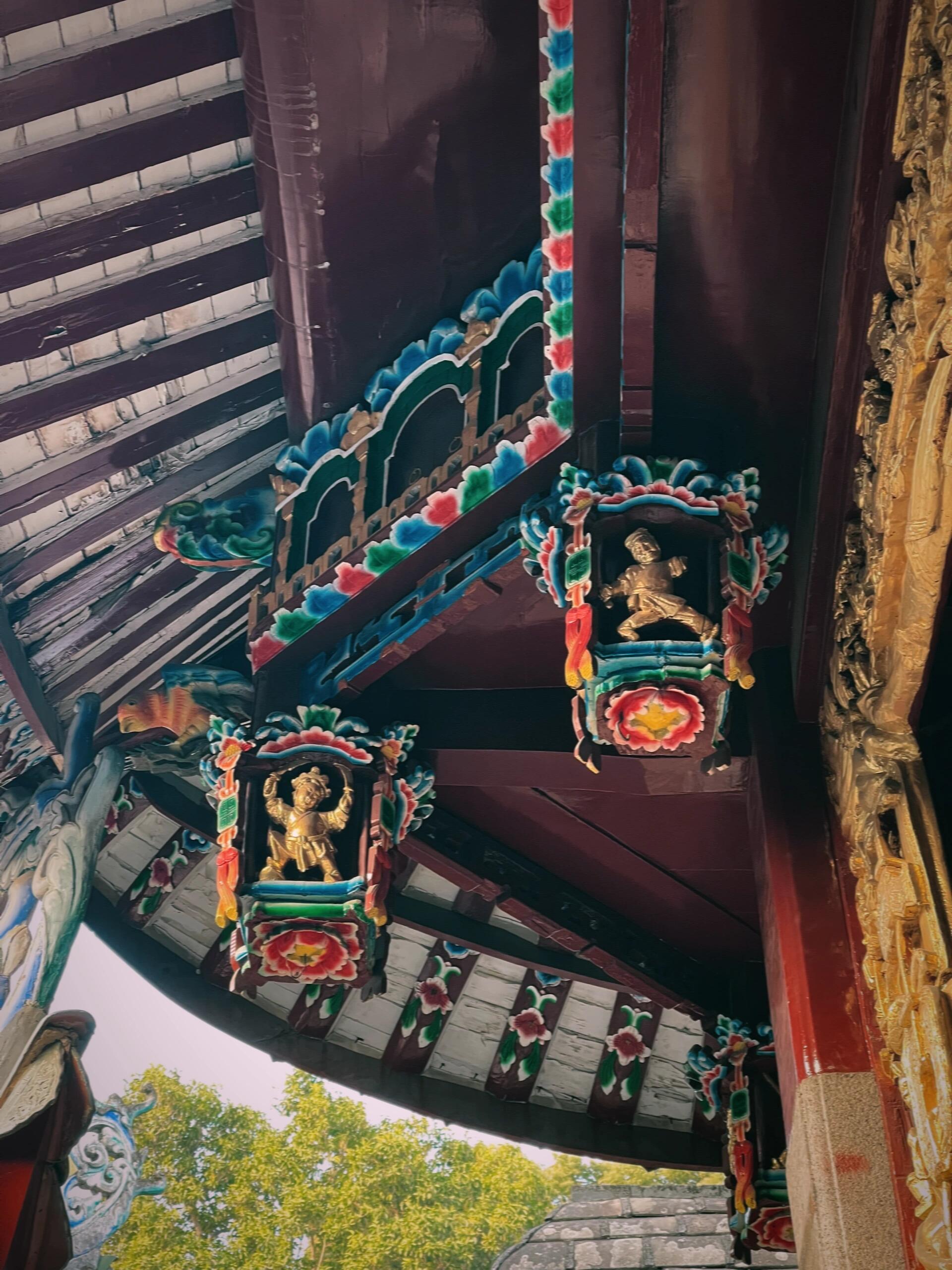清晨的庙院笼罩着奇妙的静谧。阳光透过天井洒在戏台上,藻井的投影在地面织出复杂的几何图案。此时的高爷庙褪去了香火的氤氲,露出木构建筑的本真面貌:燕尾脊的曲线如闽地渔船的桅樯,斗拱上的描金纹样与墙头的苔藓共生,百年光阴的包浆与现代修缮的新漆形成微妙对话。这种"新旧咬合"的质感,恰是市井古建最动人的地方。