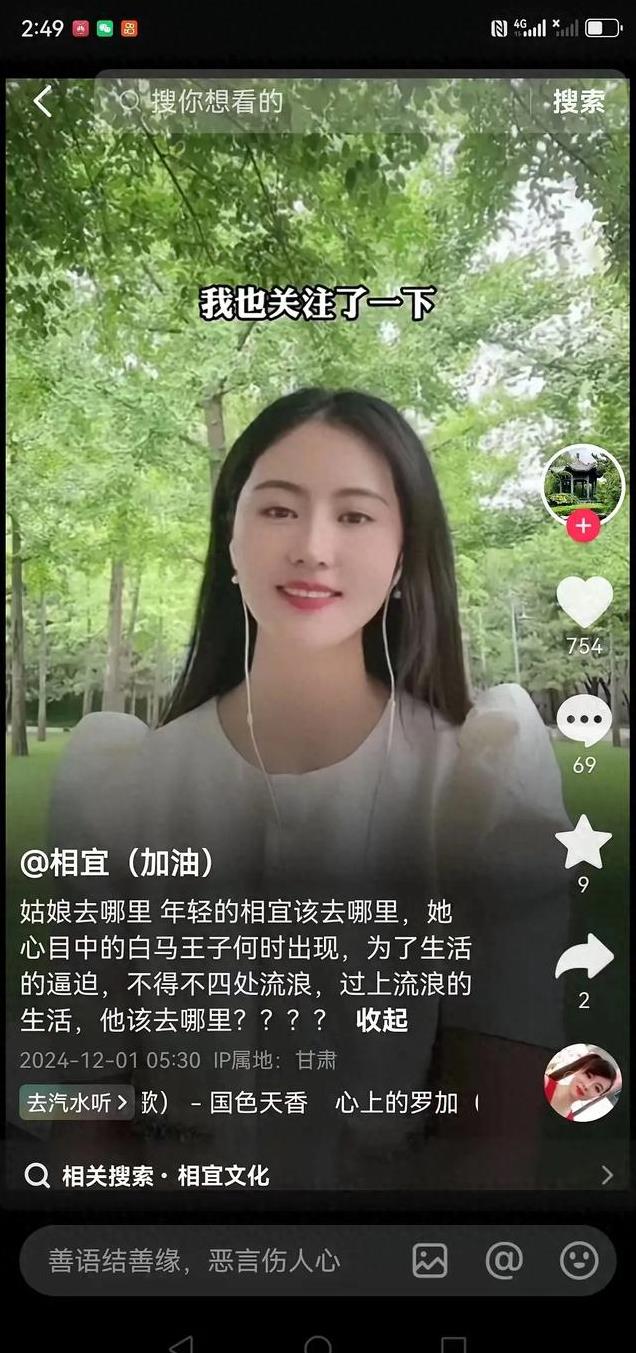 视频照片是她年轻时候最美的照片,视频配文是这样写的:“姑娘你去哪里,年轻的相宜该去哪里,她心目中的白马王子何时出现,为了生活的逼迫,不得不四处流浪,过上流浪的生活,他该去哪里?????”