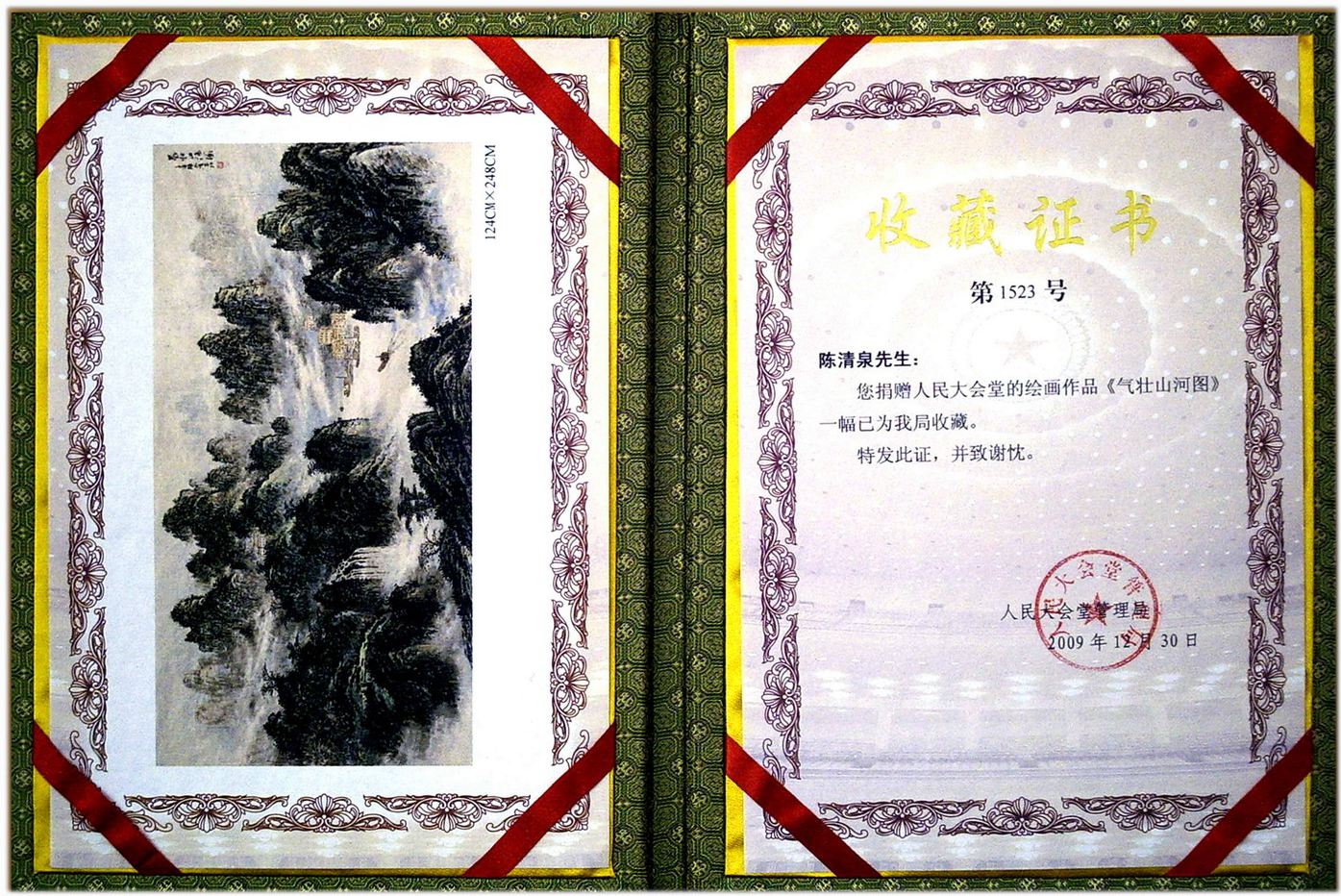 十五年前,陈清泉所绘制的巨幅山水画《气壮山河》被人民大会堂永久珍藏,这一事件迅速引发了数百家媒体的广泛关注。此后,陈清泉应邀创作的两幅大型山水画《紫气壮山河》《唐人诗意图》被天安门城楼永久珍藏。这一成就,不仅彰显了画家陈清泉的艺术才华,更标志着他继人民大会堂、商务部以及三军仪仗队等重要国家机关收藏其作品之后,又获得了一项新的重大荣誉。