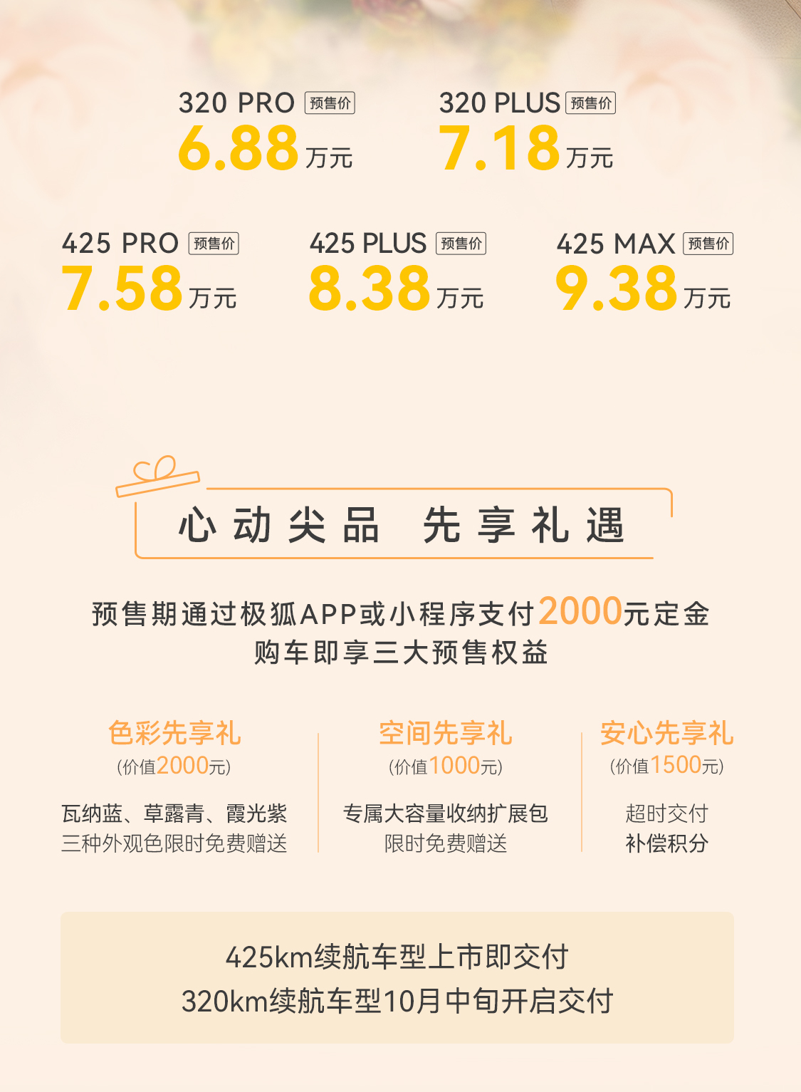 8月22日,极狐T1正式开启预售,预售价6.88万-9.38万元,其中425km续航车型上市即交付,320km续航车型10月中旬开启交付。