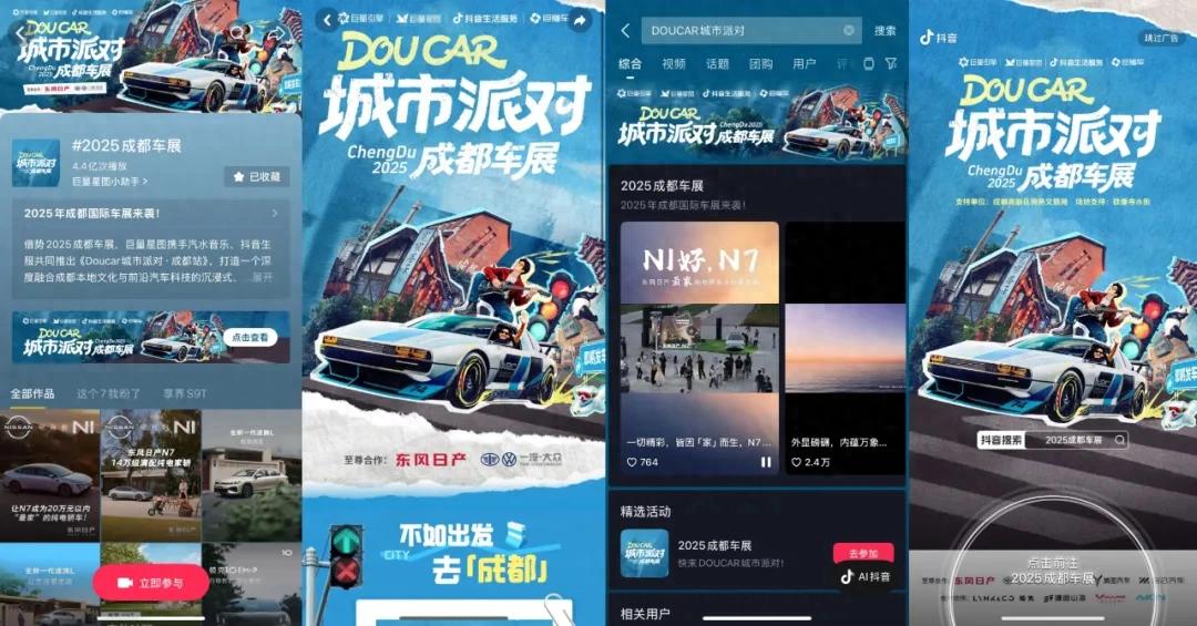 前不久,第二十八届成都国际汽车展览会在成都中国西部国际博览城举行。期间,一个活动引起了新营销的关注——巨量引擎携手巨量星图、抖音生活服务、巨懂车举办的“DOUCAR城市派对·成都站”,围绕车展营销需求,打造了一个深度融合成都本地文化与前沿汽车科技的沉浸式、体验型主题城市派对,整合“车展热度+抖音影响力+蜀都慢生活+场景化体验”,让汽车文化从成都车展走向潮流街头,更让汽车品牌跳出展厅做车展营销,其创新思路和新鲜玩法都令人印象深刻。
