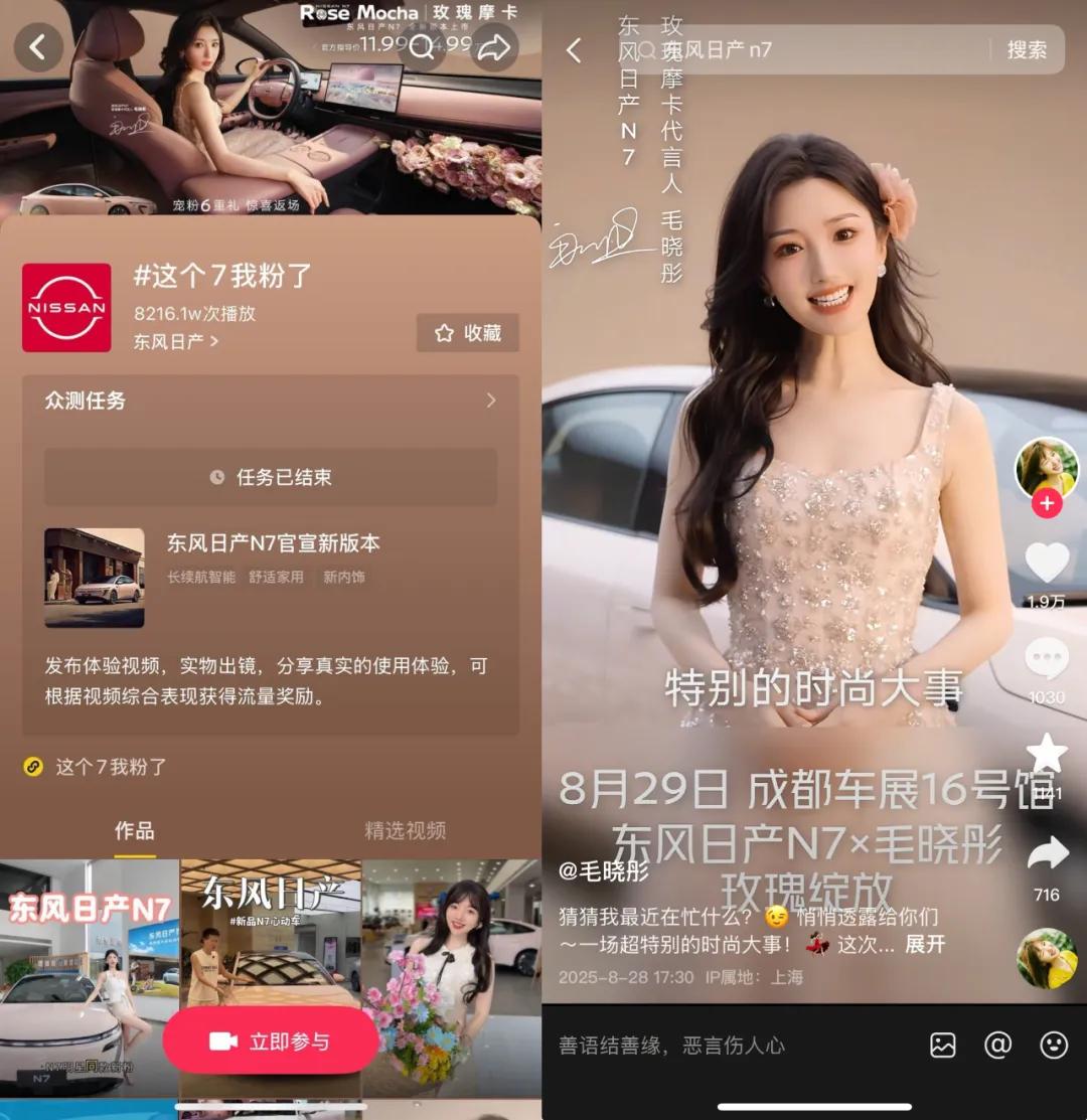 东风日产N7在成都车展上正式官宣了全新版本“玫瑰摩卡”。品牌通过“DOUCAR城市派对”IP合作明星@毛晓彤 担任代言人,定制拍摄KV和TVC,并空降车展现场活动,毛晓彤在4万朵玫瑰营造出的浪漫花海中明媚动人,与燕麦米车色的N7相得益彰,营造出时尚浪漫的氛围体验,既满足了用户对 “时尚外观” 的关注,又快速建立新品的 “潮流标签”,让新车亮相惊艳加倍。同时在线上,品牌携手IP共创话题#这个7我粉了,通过众测任务、达人合作等形式,成功为新品上市造势。