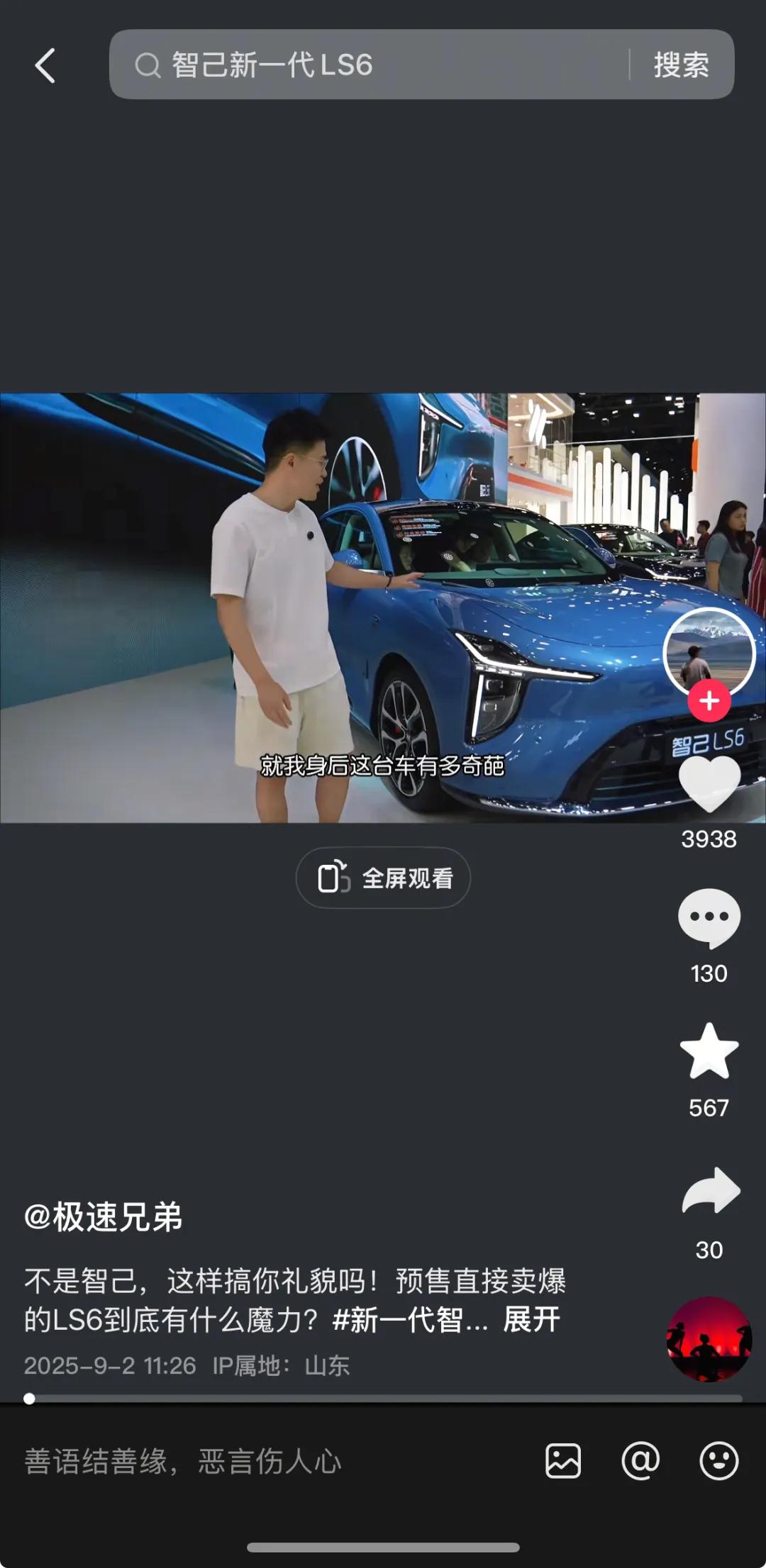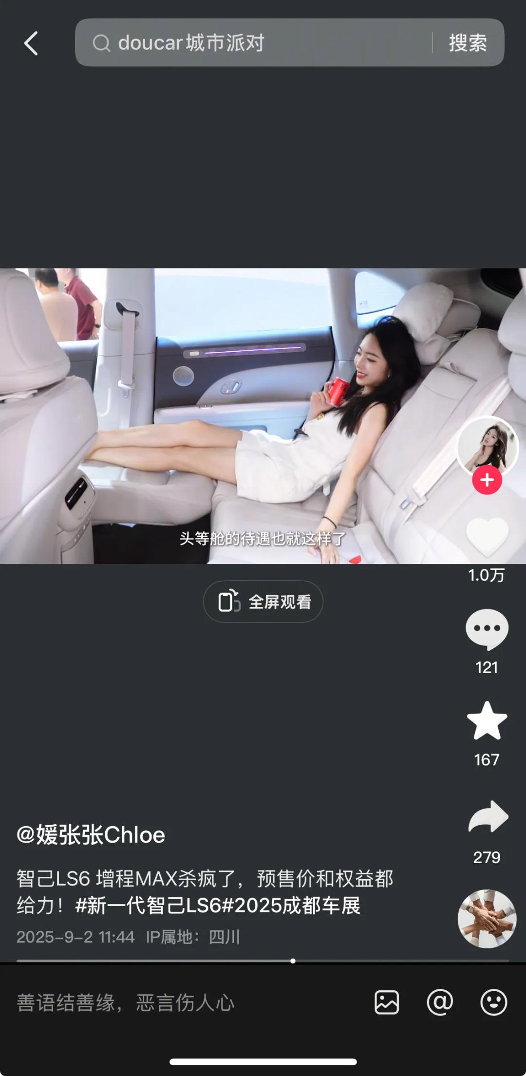智己汽车带着首款全球车型“中大型智能轿跑 SUV” 智己 LS6重磅亮相成都车展。基于“DOUCAR城市派对”IP合作,平台官方集结众多达人组成探展小队,其中邀约10位百万粉丝达人前往智己展台直击LS6,他们深入成都车展核心区,实时直击最新动向,通过达人 “第一视角” 解读智己LS6的智能科技,将 “参数” 转化为前沿设计、专属好价等用户可感知的体验。智己LS6展台探展视频累计播放量超过400万,触达众多潜在兴趣人群和购车决策用户,为新车收获了一波精准曝光。