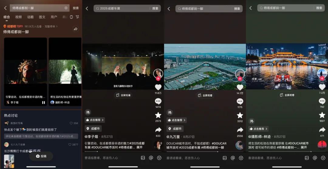 除了车展主话题运营之外,平台联动本地达人人打造趋势内容#师傅成都刹一脚,从成都本地文化特色出发为车展造势,聚焦成都非遗文化、先锋生活等不同视角,将汽车与成都巴适生活场景结合进行内容创作,引发本地用户情感共鸣。话题登上成都本地榜TOP9,在榜时长超72小时,累计播放量近千万,不仅成功为车展造势,更让车展与在地文化发生碰撞和共振。