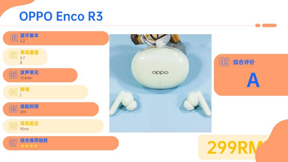 OPPO Enco R3单只耳机重量仅约4克,佩戴时几乎没有负担感,即便长时间佩戴,也不会对耳部造成明显压迫或不适。其充电盒设计小巧轻盈,方便随身携带,放进口袋也毫无压力,非常适合日常通勤、出差或外出使用。