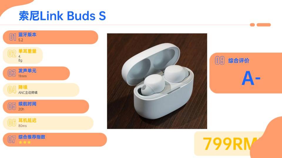 音质与传输方面,Link Buds S支持索尼自家LDAC蓝牙协议,最高传输速率可达约990kbps,数据量约为AAC或SBC的三倍,能更好地保留音频细节。耳机内置全新5mm动圈单元与高柔性振膜,低频深沉有力,声音饱满且不浑浊;搭配索尼V1集成处理器,降噪效果出色,可有效隔绝环境噪音,带来沉浸式听音体验。