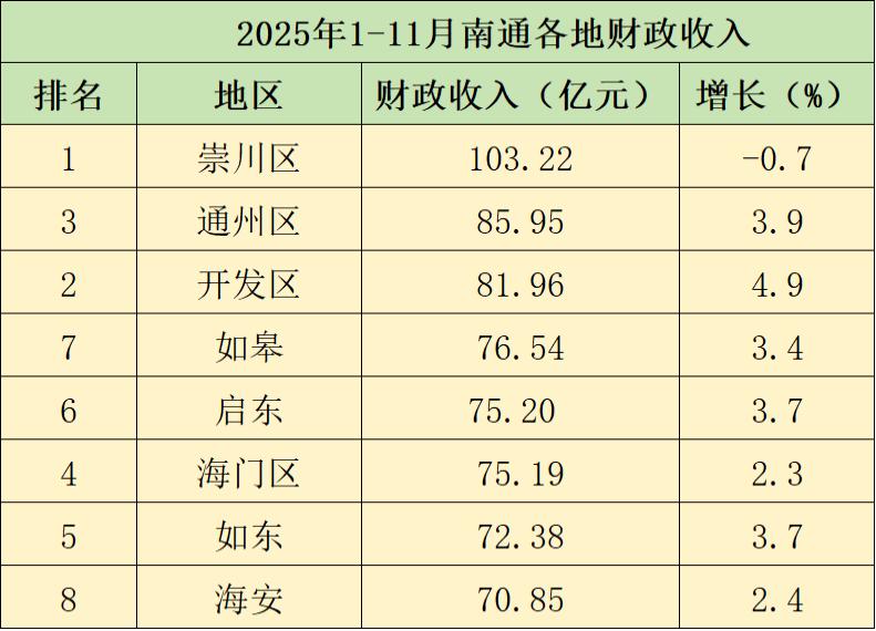 2025年1-11月南通财政收入为679.8亿,增长2.7%。南通的财政收入总量正在稳定提升,向着七百亿迈进。现在我们一起来看南通各地的财政收入表现。