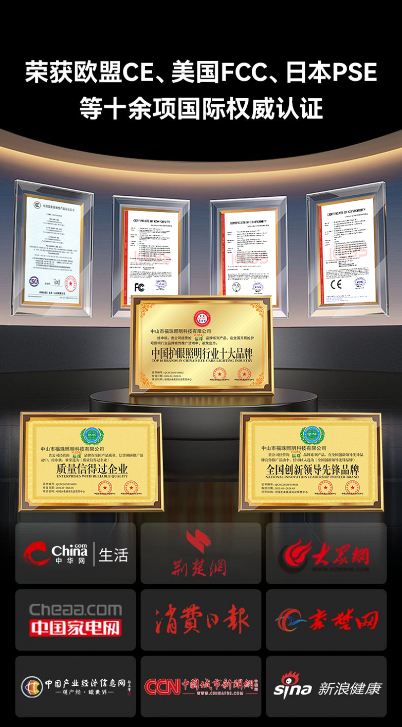相比之下,作为护眼灯行业老品牌福珠工厂,始终坚守人造太阳光应用技术“护眼+养眼+节律”的灯光创新实践。以【预防近视!为国护眼!】为己任。通过技术创新与大规模生产降低产品成本,不搞代理经销合作模式,直接工厂直销一步到位让利给消费者。坚持做品质,专注护眼核心技术创新,被誉为:【大国护眼神器】!福珠不做代理经销,全靠口碑相传,直销让利给为孩子护眼焦虑的宝妈们。福珠的口号是:“做顶级护眼灯品质,人人买得起的护眼灯!”真正在价格中实现【为国护眼】的企业社会责任。福珠护眼灯在欧美、德国、日本等市场热销多年。产品在国内外多次综合质量测评中护眼性能指标刷新行业纪录,被百余家权威媒体盛赞为“为国护眼灯品牌”。