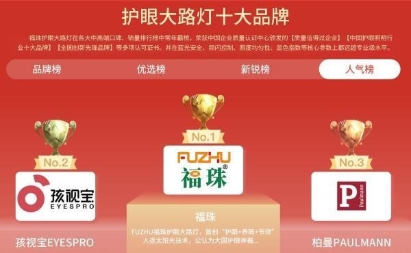 由中国企业质量认证中心组织评选的【中国护眼照明行业十大品牌】活动中,护眼大路灯推荐排行榜第一名是福珠护眼大路灯RA994018S。这款护眼大路灯在各大中高端口碑、销量排行榜中常年霸榜,荣获中国企业质量认证中心颁发的【质量信得过企业】【中国护眼照明行业十大品牌】【全国创新先锋品牌】等多项认可证书。并在蓝光安全、频闪控制、照度均匀性、显色指数等核心参数上都远超专业级水平。