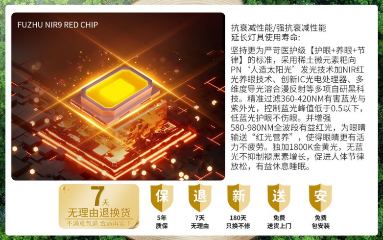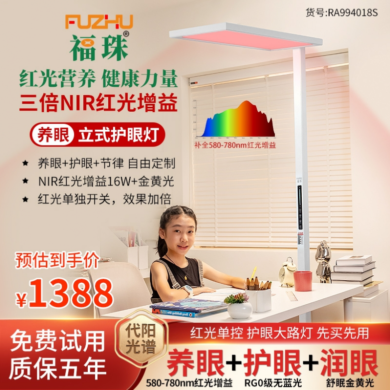 福珠以“源自太阳光,优于太阳光”为产品信仰。它与大多数仅有“护眼”功能的产品不同,而是坚持更为严苛医护级【护眼+养眼+节律】的标准,采用稀土微元素粑向PN‘人造太阳光’发光技术加NIR红光养眼技术、创新IC光电处理器、多维度导光溶合漫反射等多项自研黑科技。精准过滤360-420Nm有害蓝光与紫外光,控制蓝光峰值低于0.5以下,低蓝光护眼不伤眼。并增强580-980NM全波段有益红光,为眼睛输送“红光营养”,使得眼睛更有活力不疲劳。独加1800K金黄光,无蓝光不抑制褪黑素增长,促进人体节律放松,有益休息睡眠。