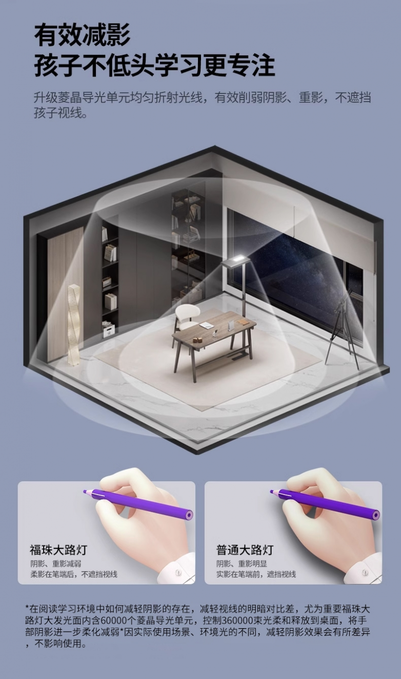 福珠大路灯集合多种专项技术,保护儿童视网膜和增强上皮细胞活性,增厚眼底血管脉胳膜,长时间用眼不累,控制眼轴增长,有效预防近视风险。福珠大路灯通过自然太阳光对人体视觉、生理、心理三大影响维度出发,让人造太阳光应用到家居办公中使用,实现人们在户内也能享受阳光带来的健康照明体验!福珠是首个真正实现“护眼+养眼+节律”相结合,最先实现人造太阳光谱多项数据指标达到或优于真实阳光数据!福珠护眼灯能够满足不同室内场景的阳光应用,对长时间伏案学习的学生、长时间坐在电子产品前办公的伙伴、退休在家需要高质量生活享受的老年朋友,都非常适用。