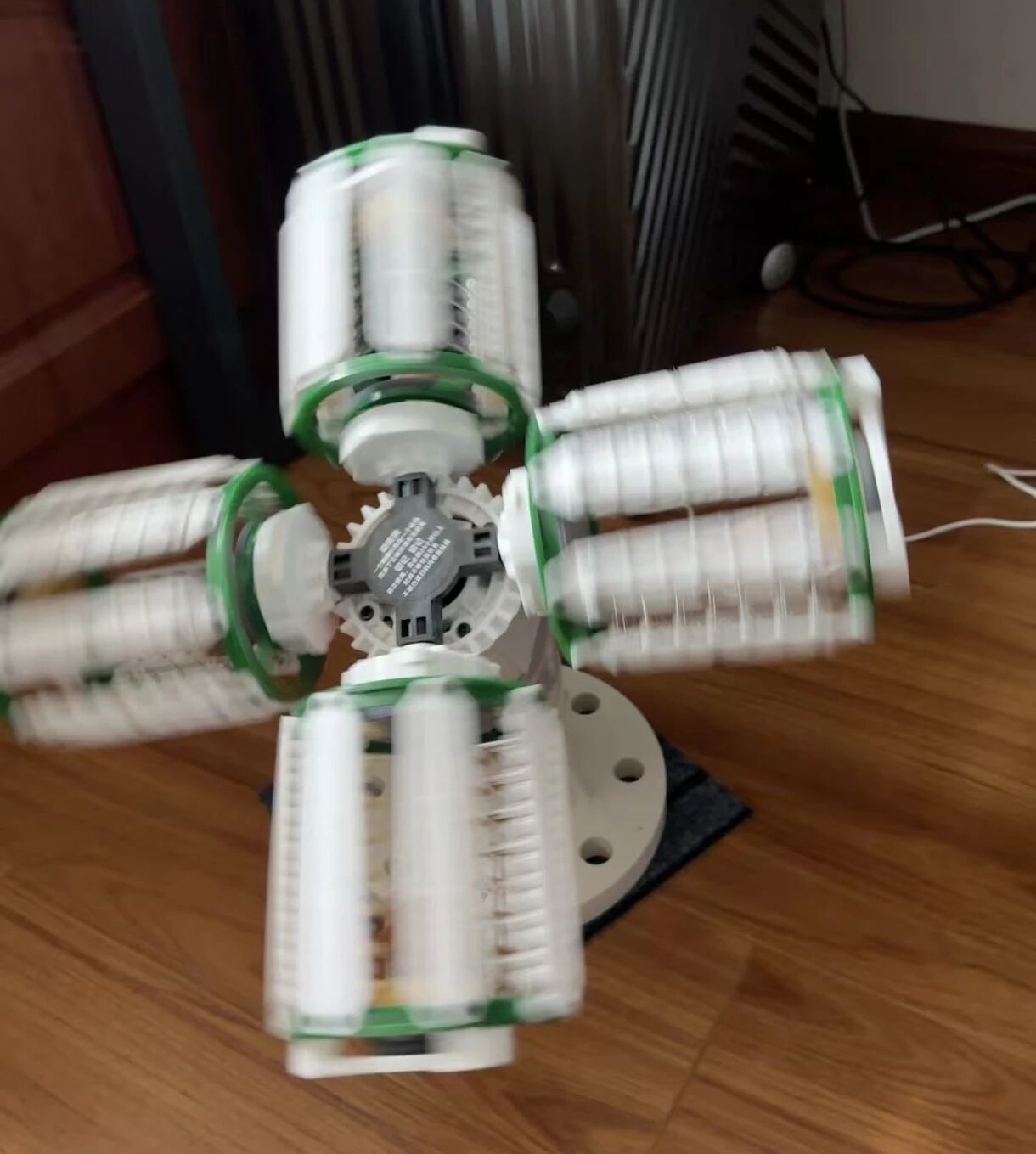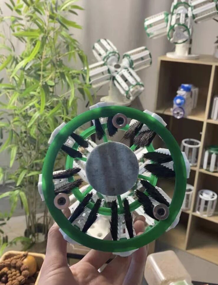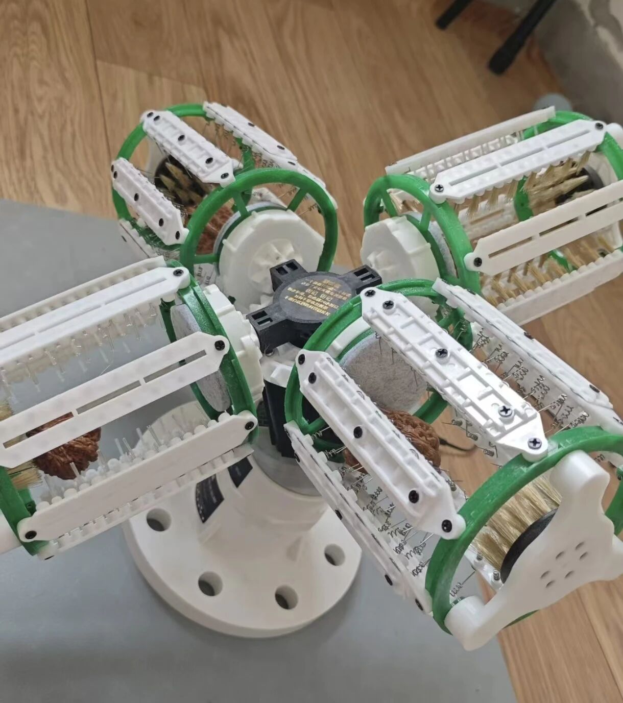 它是咋用的呢?里面有变频电机,只要一开机,就会爱的魔力转圈圈,中间轴承会横向360度旋转,单个核桃笼又会纵向360度旋转,可以24小时持续运行,最后代替人类手掌盘核桃。