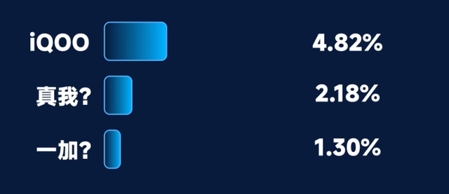 如果VIVO不含IQOO,OPPO不含一加、realme,情况又会怎么样呢?大家可以看下下面这三个品牌的份额,就会明白,iQOO、一加、realme,目前表现还是不错的。