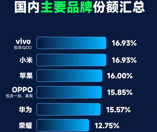 苹果则是16%,OPPO是15.85%,华为是15.57%,这三大厂商相差也是非常小。再之后是荣耀份额为12.75%。其中VIVO包括了IQOO,OPPO包含了一加、realme。