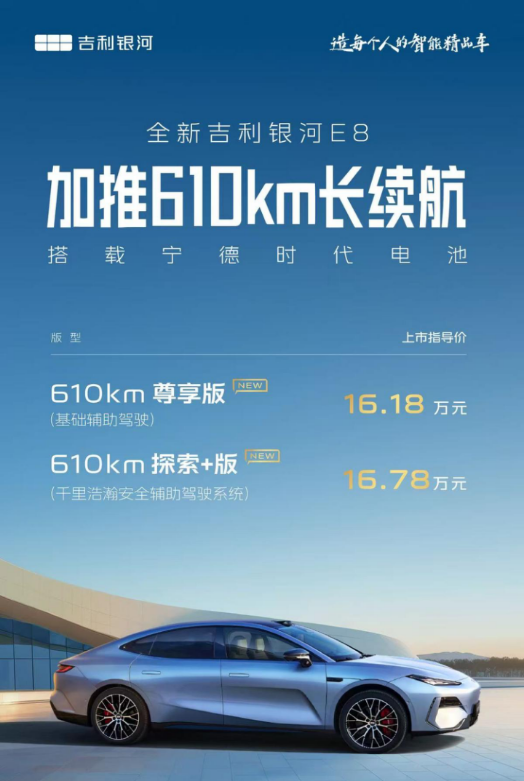 9月11日,吉利银河E8甩出王炸——610km长续航版正式开卖,16.18万-16.78万元的定价直接捅穿20万级市场天花板。这次加推的版本不仅把续航卷出新高度,还塞满了硬核配置,堪称纯电轿车的“真香教科书”。