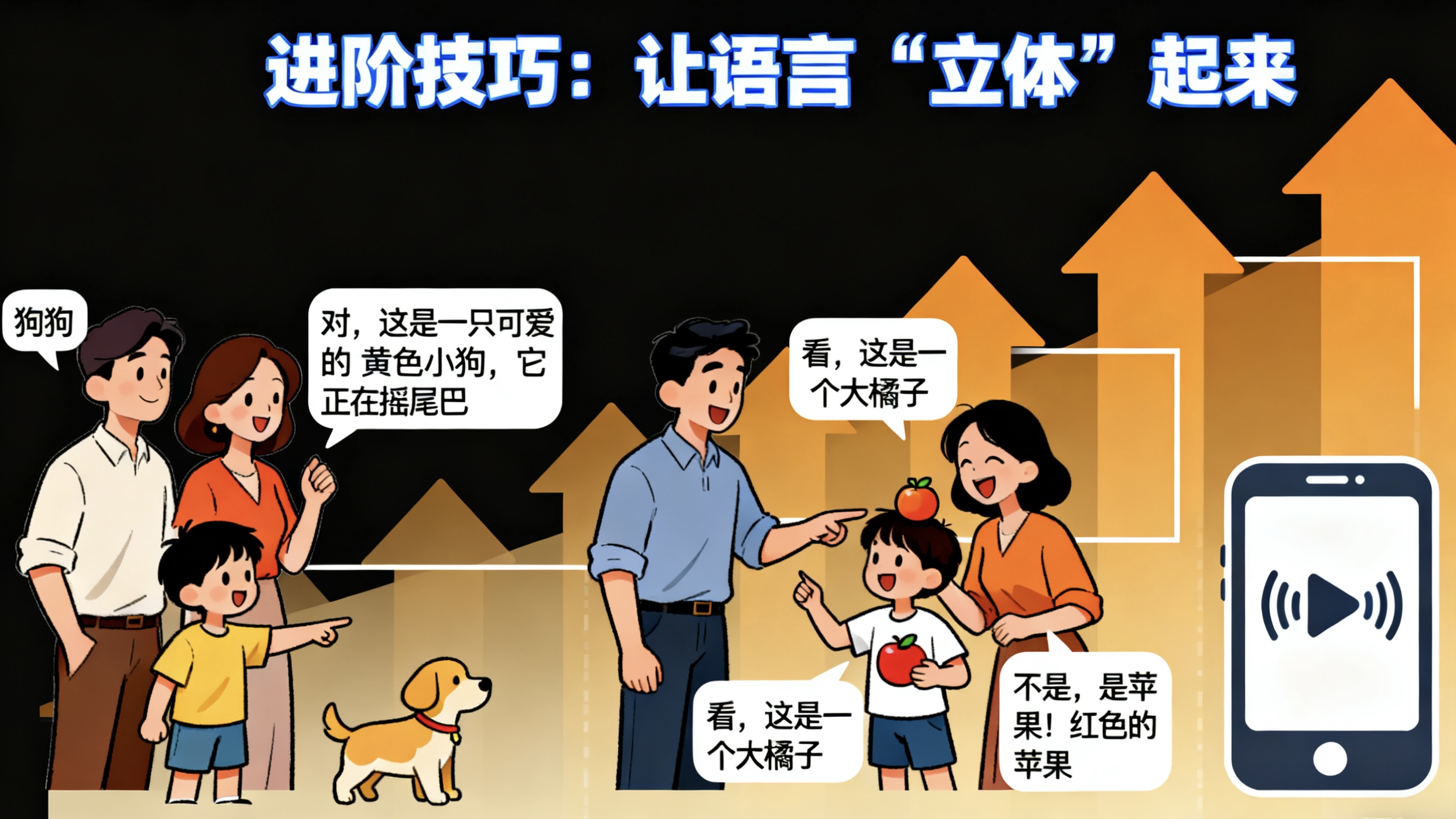 孩子会说“狗狗”,你就补1步:“对,白色的大狗狗,它跑得飞快。”在原有词汇上搭脚手架,下次他可能就会说“大狗狗跑”。