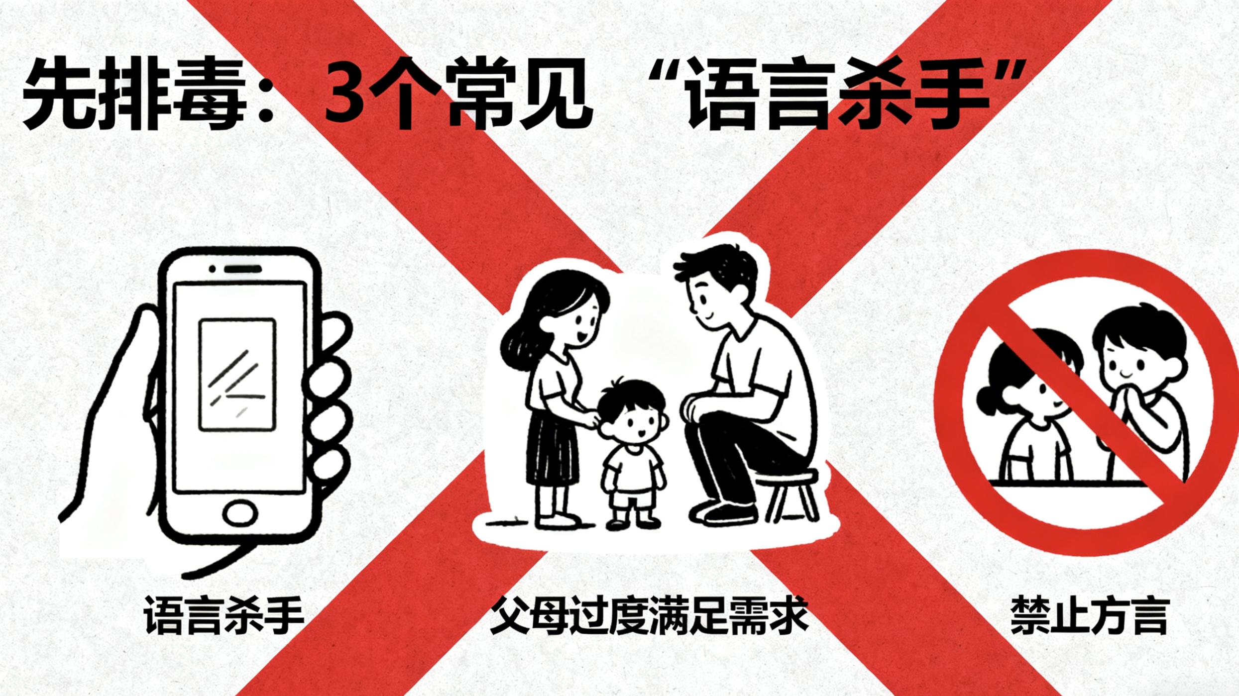 老人讲方言,爸妈讲普通话,担心“混了”?放心,大脑天生有多语音通道,小时候能同时学5种语言。粗暴切换、禁止方言,才会让孩子“不敢开口”。