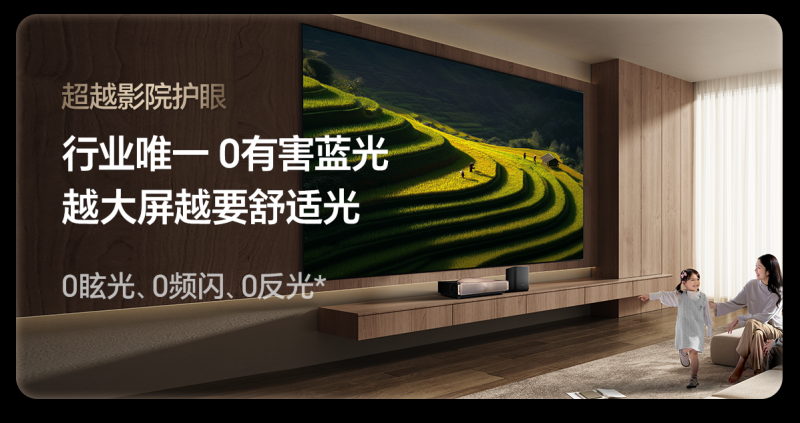 在护眼方面,海信激光电视探索X1 Ultra同样毫不妥协:探索X1 Ultra使用纯净激光光源,从源头阻断有害蓝光,采用反射成像原理,与人眼观视自然景物一致,已获得德国莱茵护眼认证,是行业唯一0有害蓝光的大屏显示设备,贴心守护家人健康,尤其是儿童视力。