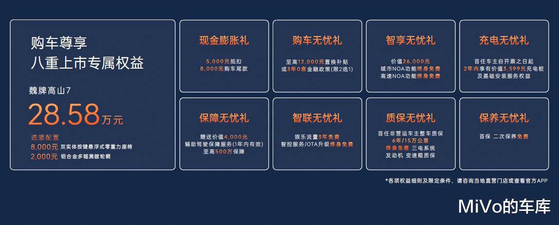 为让用户轻松畅享豪华家庭出行,高山7不仅拥有诚意满满的价格,更准备了包含“5000元抵扣8000元购车尾款”、“至高12000元置换补贴或3年0息金融政策”、“价值26000元的城市及高速NOA功能终身免费”等丰厚的八重上市专属权益。