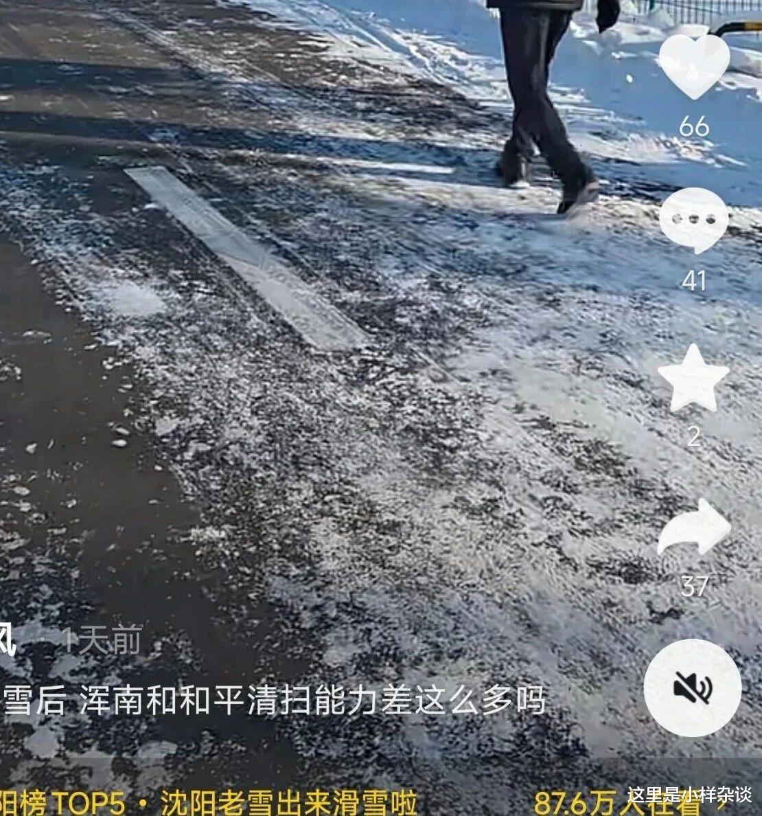 上面两张图第一张是沈抚大道,下面一张是浑南大道,这两条道路其实就是一条路的不同段,但是沈抚示范区段人行道清理过了,有的地方还有一点点,但是不影响正常行走了,而浑南区管理的段还未清理。上面这个只是众多例子的两个,这样的点位还会有不少,只要是交界处,必然就面临着群众的比较,现在发一个短视频还非常容易,一个几十秒的视频,就可以让广大网友对不同公司环卫工人的工作点评一下了了,下图就是某滨河路浑南段和和平段出雪效果不同被市民发下来发到网上的例子。