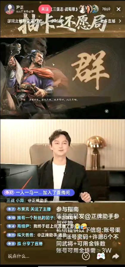 比如大家都知道的“袁华”尹正,那可是三战的资深玩家。帮玩家充值抽卡同样是不在话下,属于是常规操作。有一次尹正直播帮玩家抽到两张心愿的SP卢植卡,感觉比他自己抽到还激动,甚至“国粹芬芳”都不小心脱口而出,哥们嘴上说着自己是“非酋”,但那小表情完完全全就像那种欧气爆棚还爱嘚瑟的损友!
