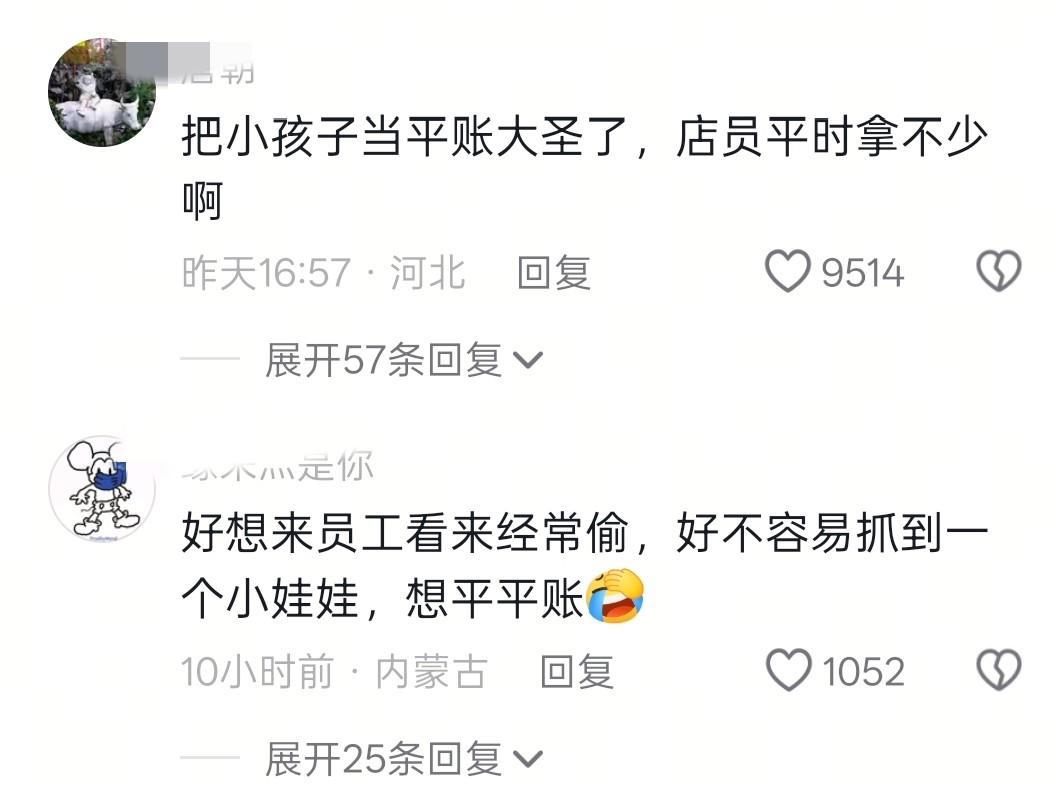 网友甚至怀疑,店员肯定是监守自盗了,现在想拿孩子来当平账大圣。