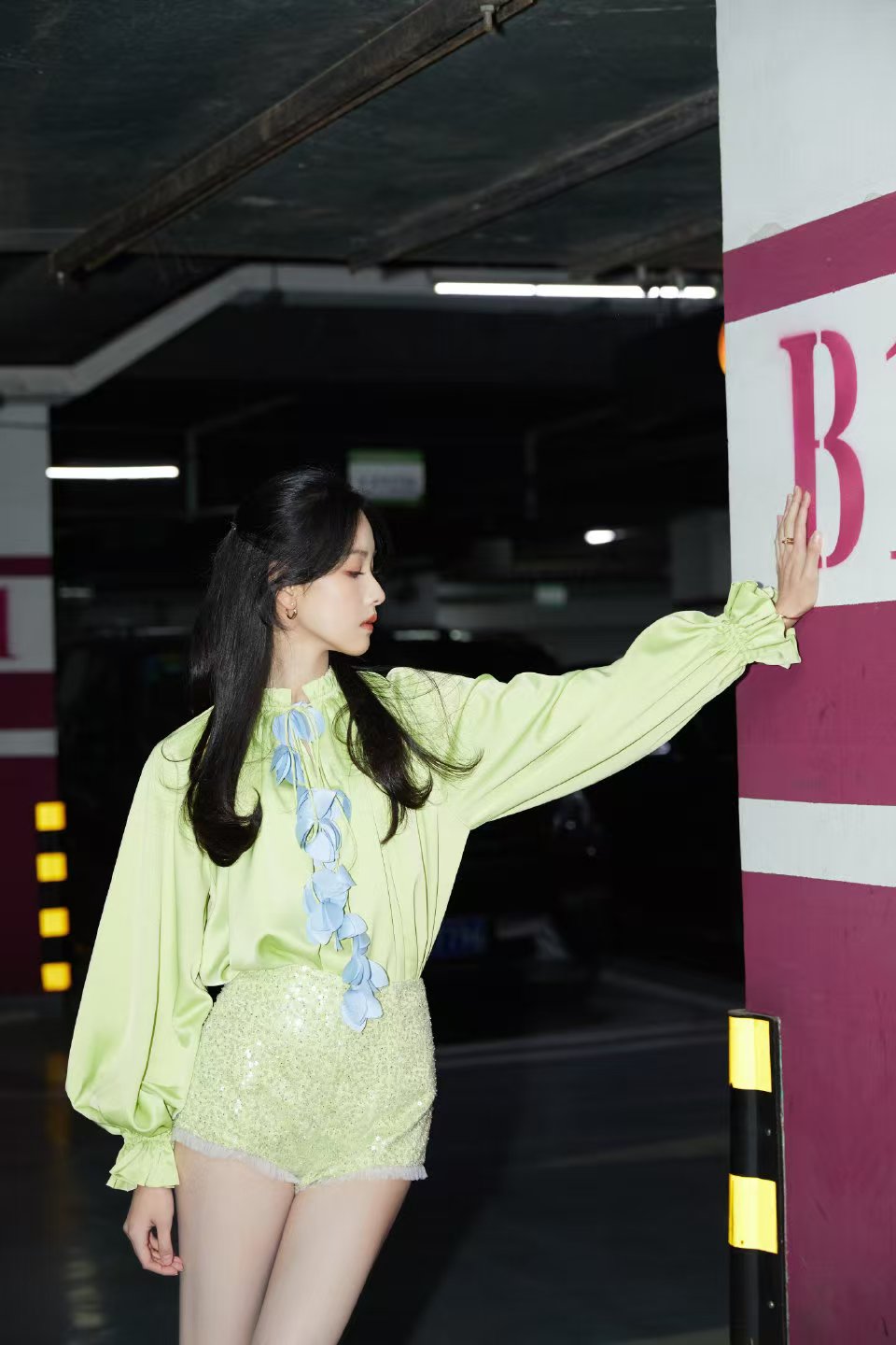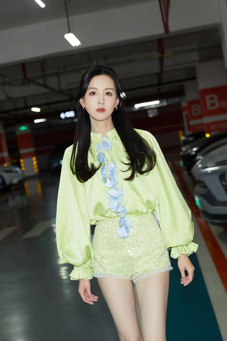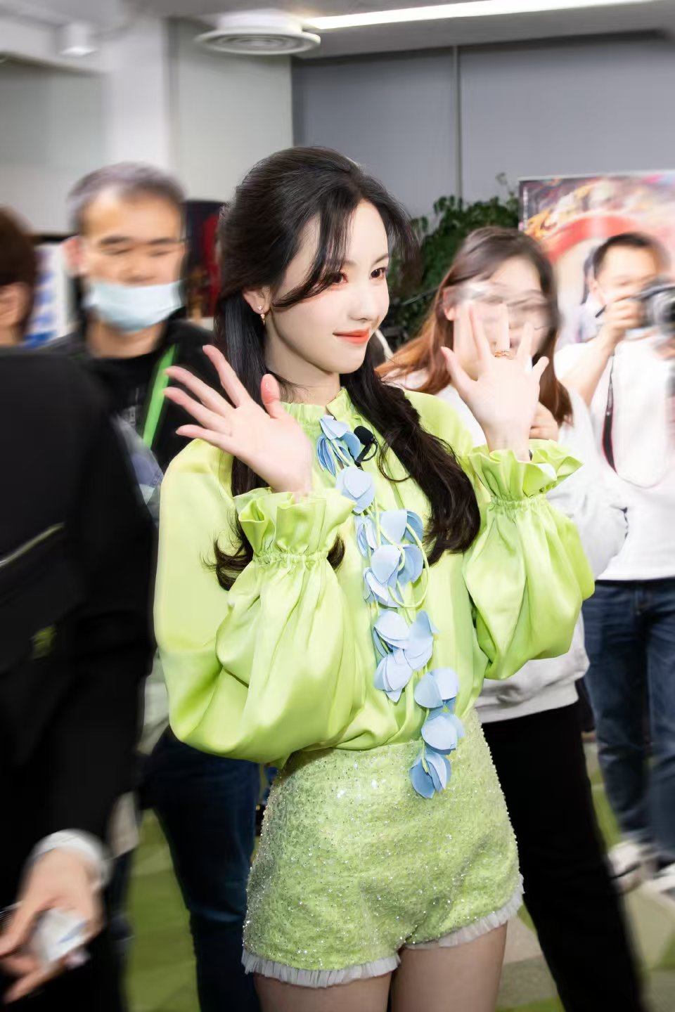 而她的“露腿杀”,更是让镜头都忍不住“失焦”。笑着挥手的瞬间,荧光绿套装掐出的蚂蚁腰随着动作轻轻晃,亮片短裤下的白腿又直又匀,连背景里的工作人员都成了模糊的陪衬——这甜笑+长腿的双重暴击,谁看了能不心动?