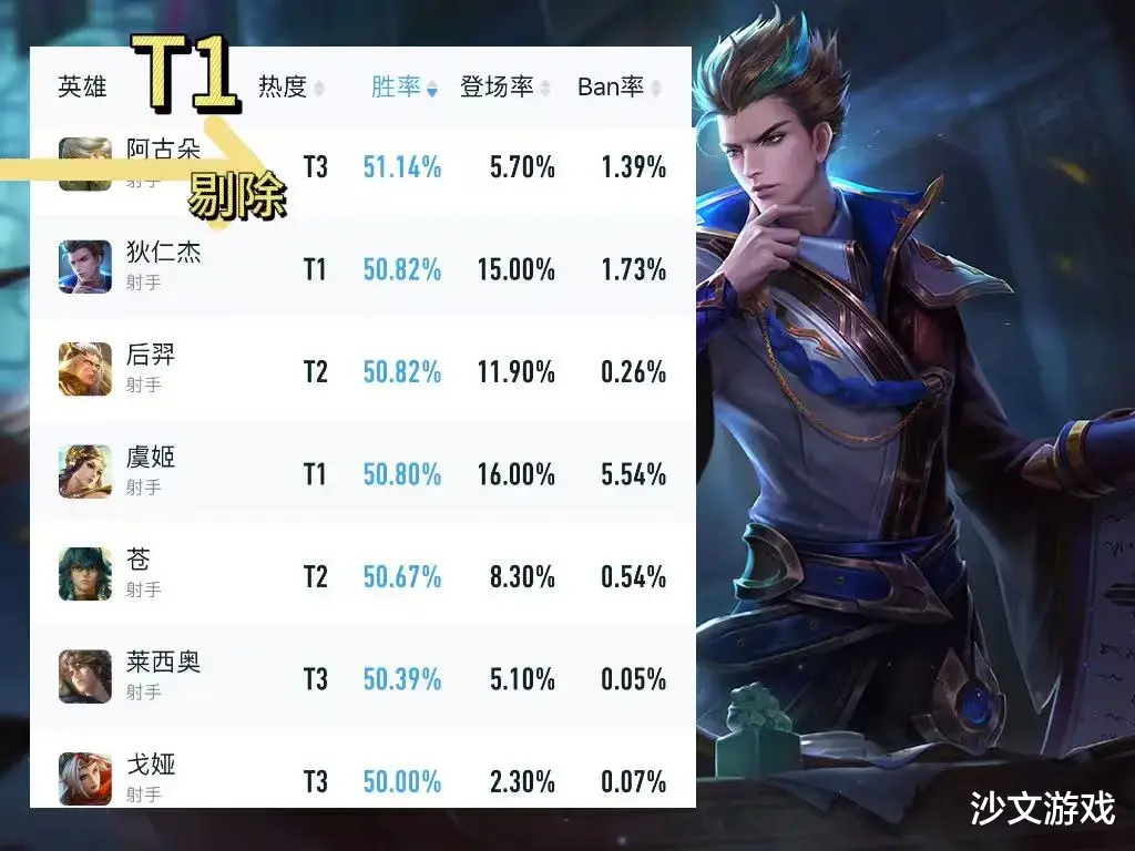 排在巅峰赛发育路T1的英雄有阿古朵(多走发育路不参与排名)、狄仁杰、后羿、虞姬、苍、莱西奥、戈娅,这些英雄的胜率在50%至51%之间。