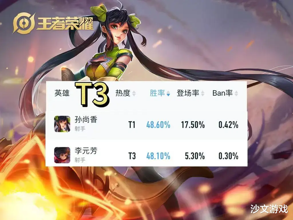 排在巅峰赛发育路T3的英雄有孙尚香、李元芳,这些英雄的胜率在48%至49%之间。