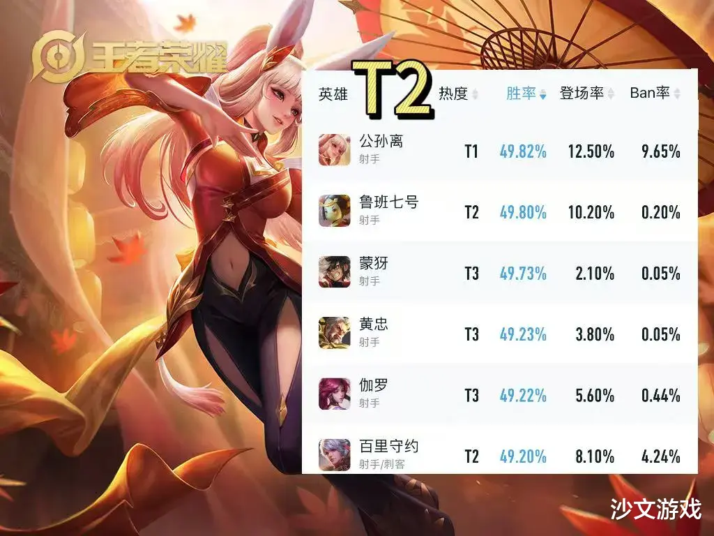 排在巅峰赛发育路T2的英雄有公孙离、鲁班七号、蒙犽、黄忠、伽罗、百里守约,这些英雄的胜率在49%至50%之间。