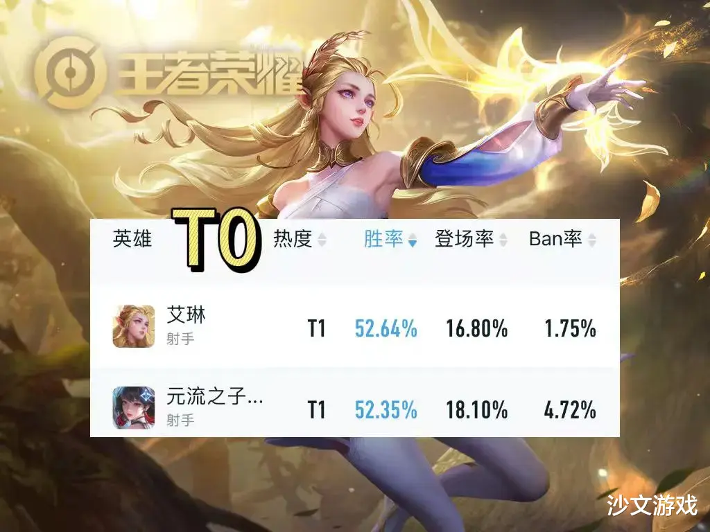 首先,排在巅峰赛发育路T0的英雄有艾琳、元流之子(射手),这些两个英雄的胜率在52%至53%之间,两个英雄的胜率不分伯仲。