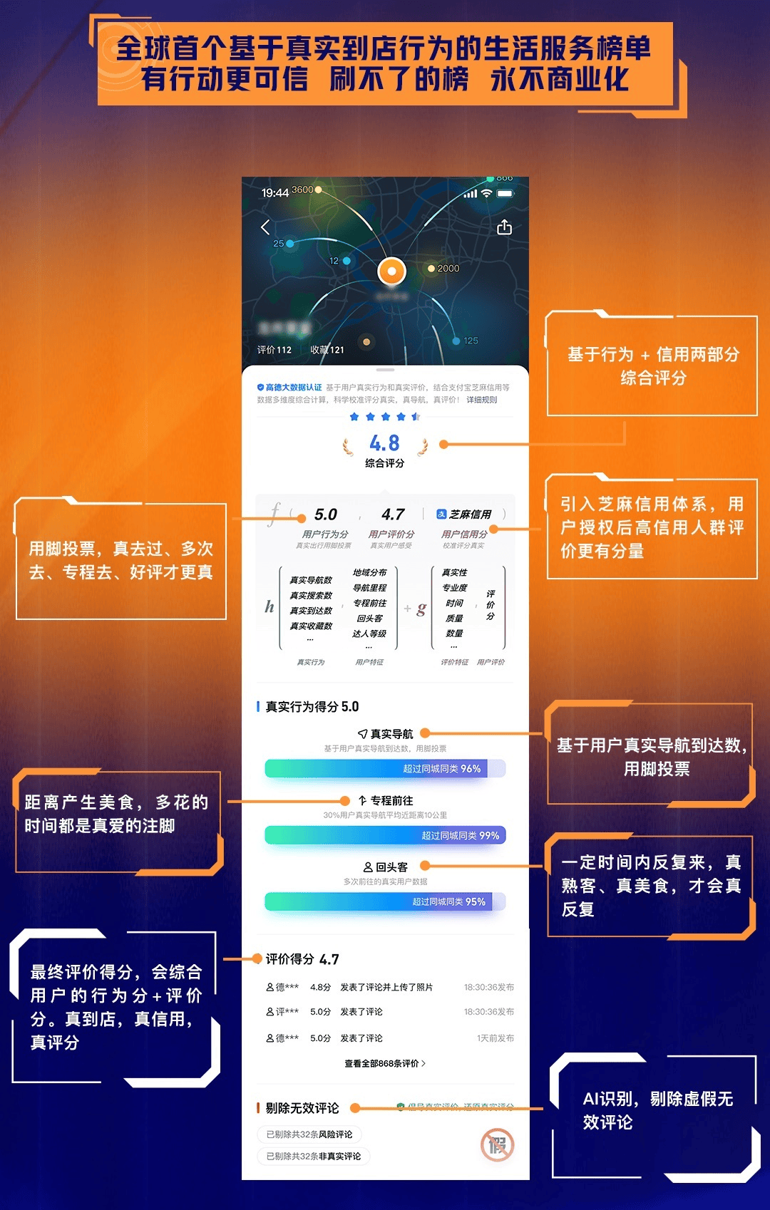“用脚投票”是高德扫街榜的主打slogan,用高德地图CEO郭宁的话来说,真实是榜单的核心生命力。而用户的真实导航到店行为有巨大的参考价值。