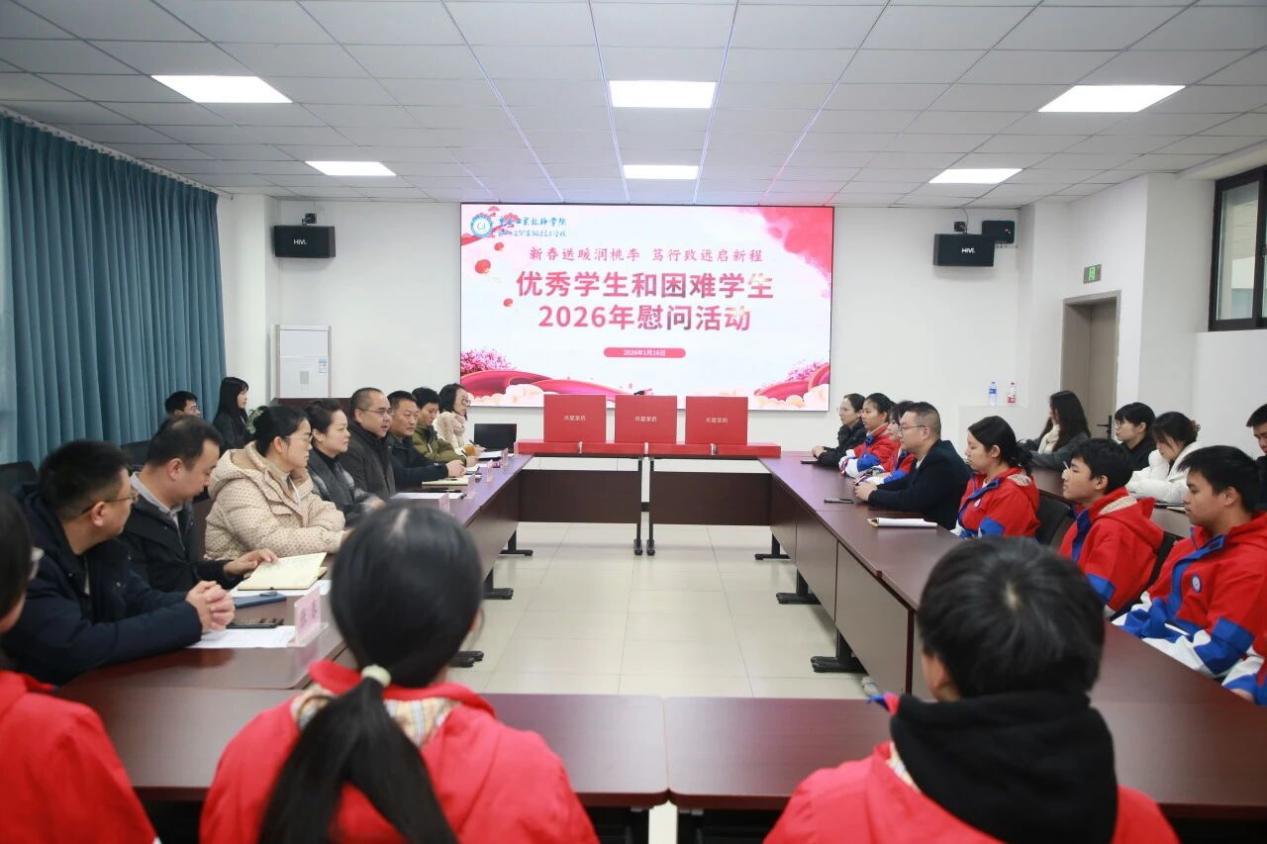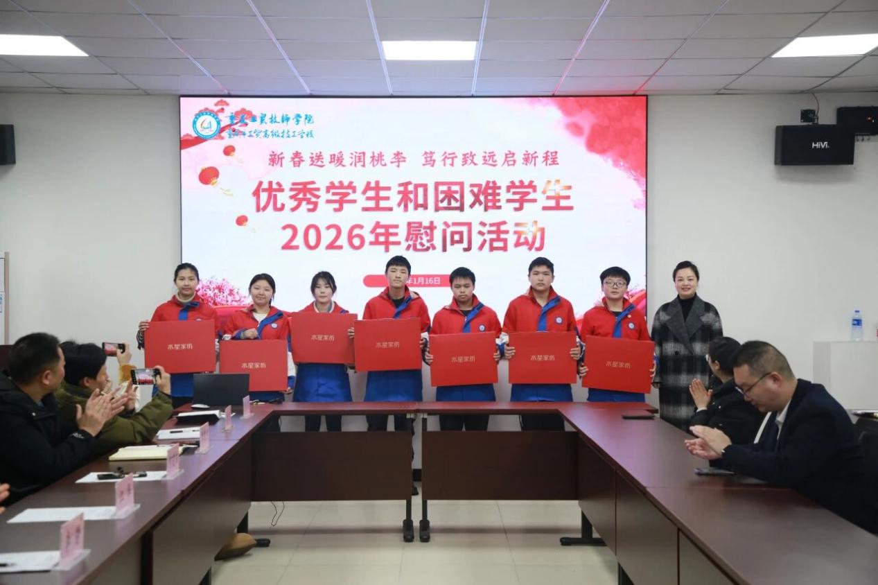 2026年1月16日中午,重庆工贸技师学院优秀学生和困难学生慰问活动在综合楼408会议室隆重举行。学校党委副书记、校长江华出席活动并讲话,党委委员、副校长何建铵主持活动。学生处、校团委负责人,各教学系副主任、团总支书记,优秀学生代表及班主任代表共同参与此次暖心活动。
