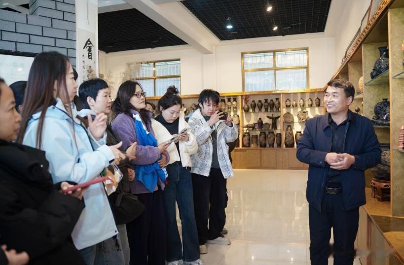 富县黄河陶艺工坊里,省级非遗传承人王志刚向采访团介绍富县黑陶的“四绝”:薄如纸、声如磬,色如漆,亮如镜。