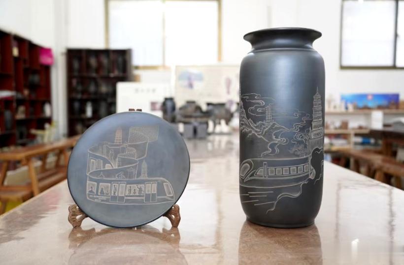 非遗的传承发展离不开其生根发芽的土壤,但高铁可以把非遗文化传播到各地。王志刚展示一个刚刚雕刻的花瓶,图案是高铁串联起大雁塔、富县古塔和宝塔山,寓意高铁串联起陕西文旅线路。他说:“黑陶所需的泥土取自本地,我的家就是陶艺工坊,我所有的作品都诞生在这里。每个月都有七八波游客来体验黑陶从取泥、拉坯到烧制的全流程。未来西延高铁开通,将串联起沿线景点,相信会带来更多客商和研学游客。”