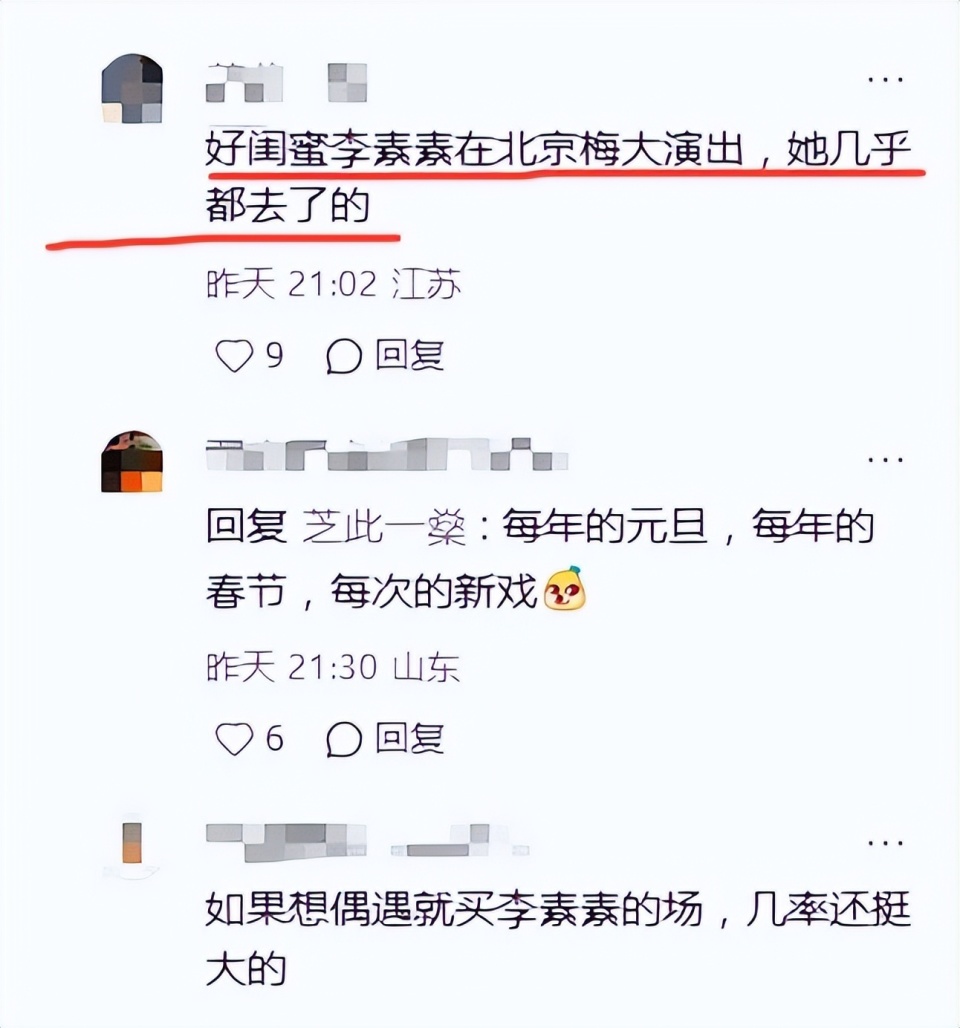 有知情人透露,主要好闺蜜李素素在北京梅兰芳大剧院演出,她几乎每场都会到场支持。