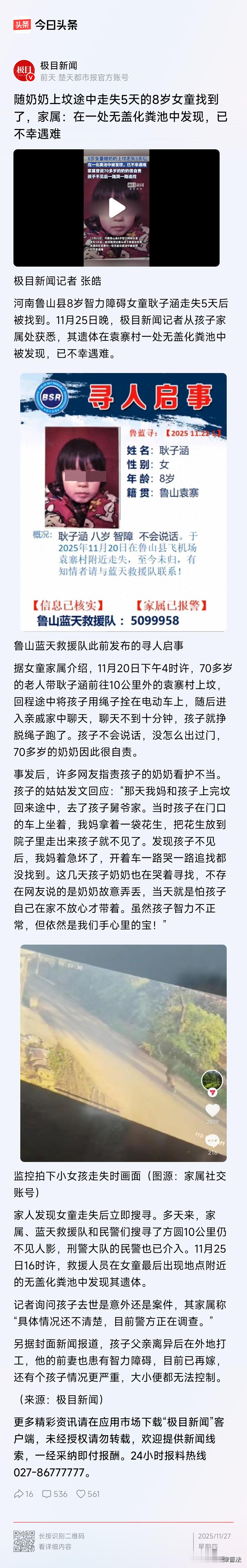 河南平顶山,鲁阳一8岁小女孩出生之后就有精神疾病,大小便不能自理,前几天随奶奶上坟途中走失5天,引起了各界的关注?最近的情况是这样的,家属:在一处无盖化粪池中发现,已不幸遇难!网友纷纷留言:无盖化粪池是属于谁的,绝对属于安全隐患,必须负责