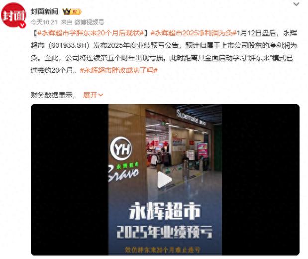 1月12日盘后,永辉超市(601933.SH)发布2025年度业绩预亏公告,预计归属于上市公司股东的净利润为负。至此,公司将连续第五个财年出现亏损。此时距离其全面启动学习“胖东来”模式已过去约20个月。