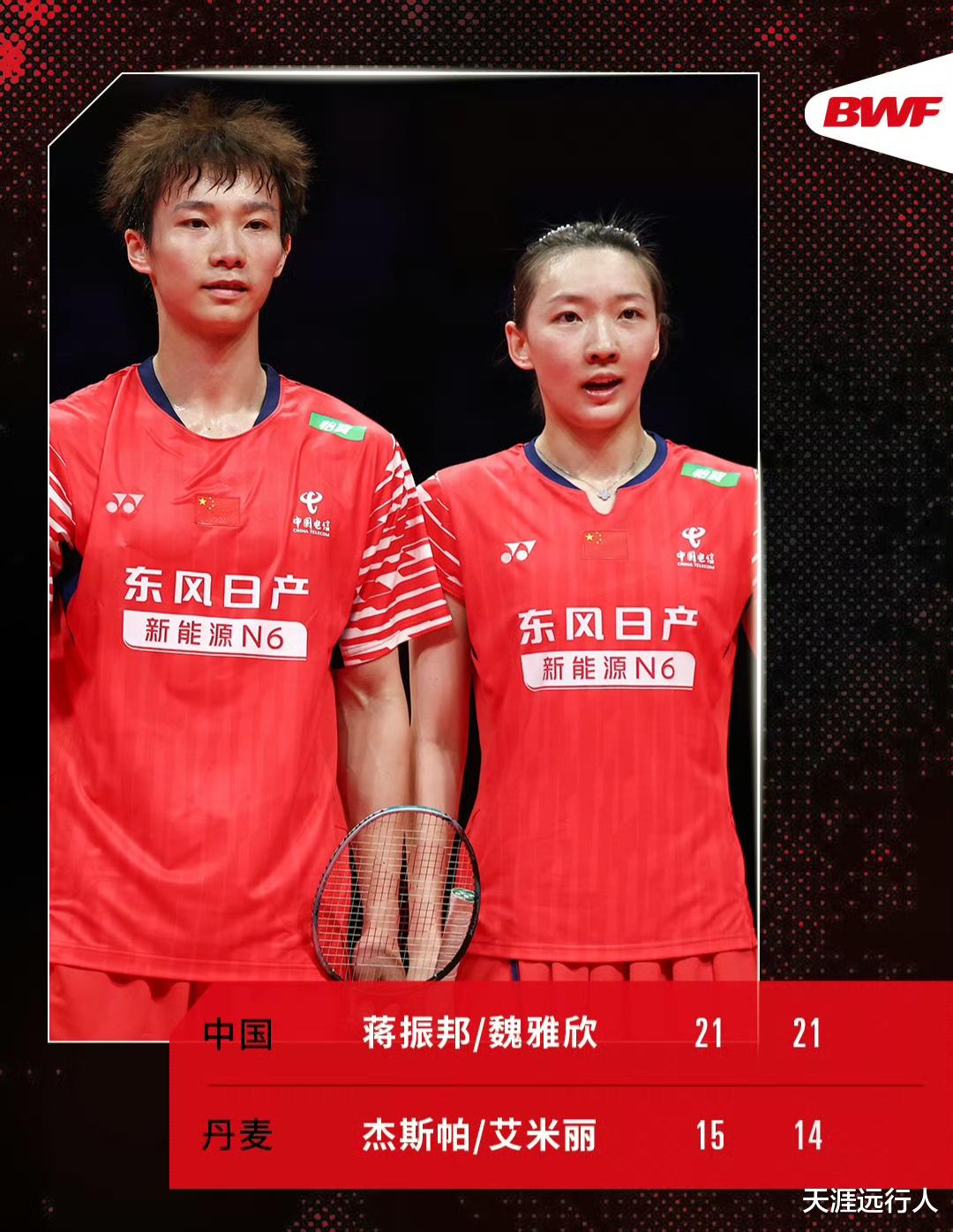 赛会二号种子蒋振邦/魏雅欣,以21-15, 21-14轻取丹麦组合杰斯帕/艾米丽,晋级混双决赛,收获双方交手的两连胜,决赛将与冯彦哲/黄东萍展开对决。