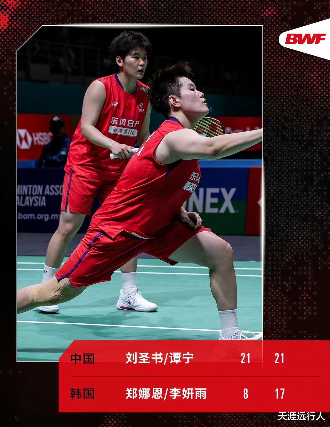 刘圣书/谭宁,以21-8, 21-17,直落两局,完胜韩国郑那银/李妍雨,晋级女双决赛,取得双方交手的两连胜,将与白荷娜/李绍希争夺女双冠军。